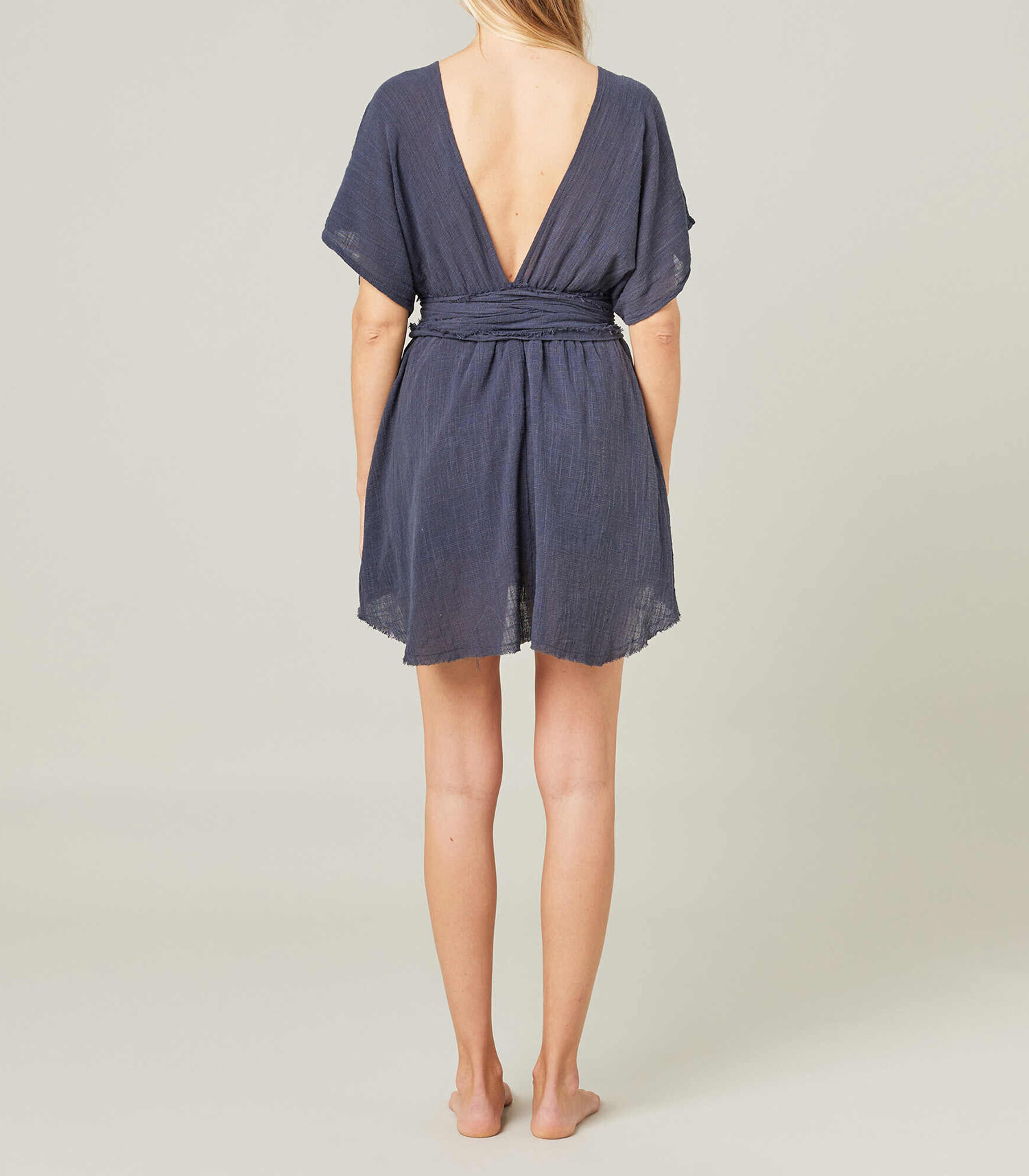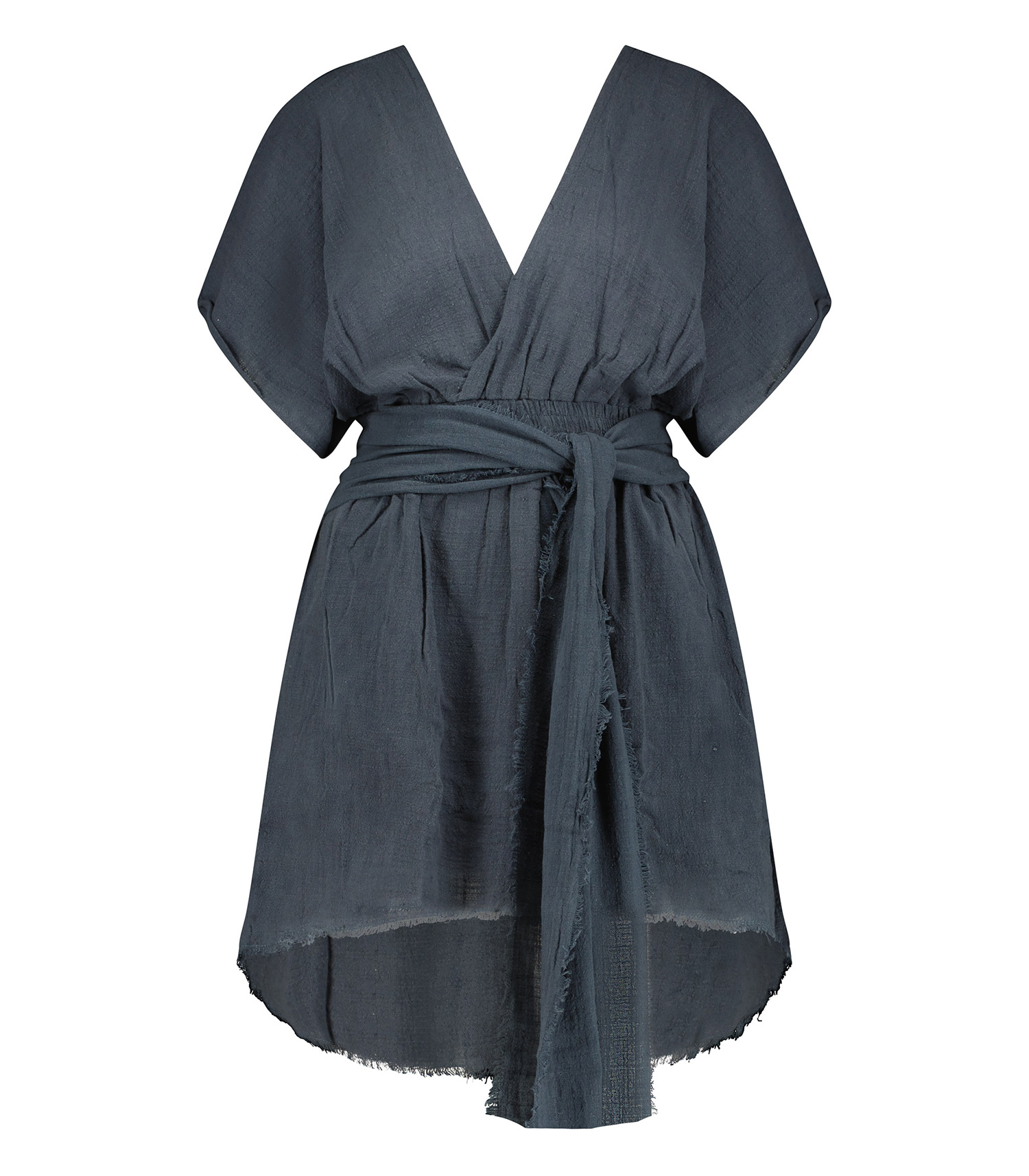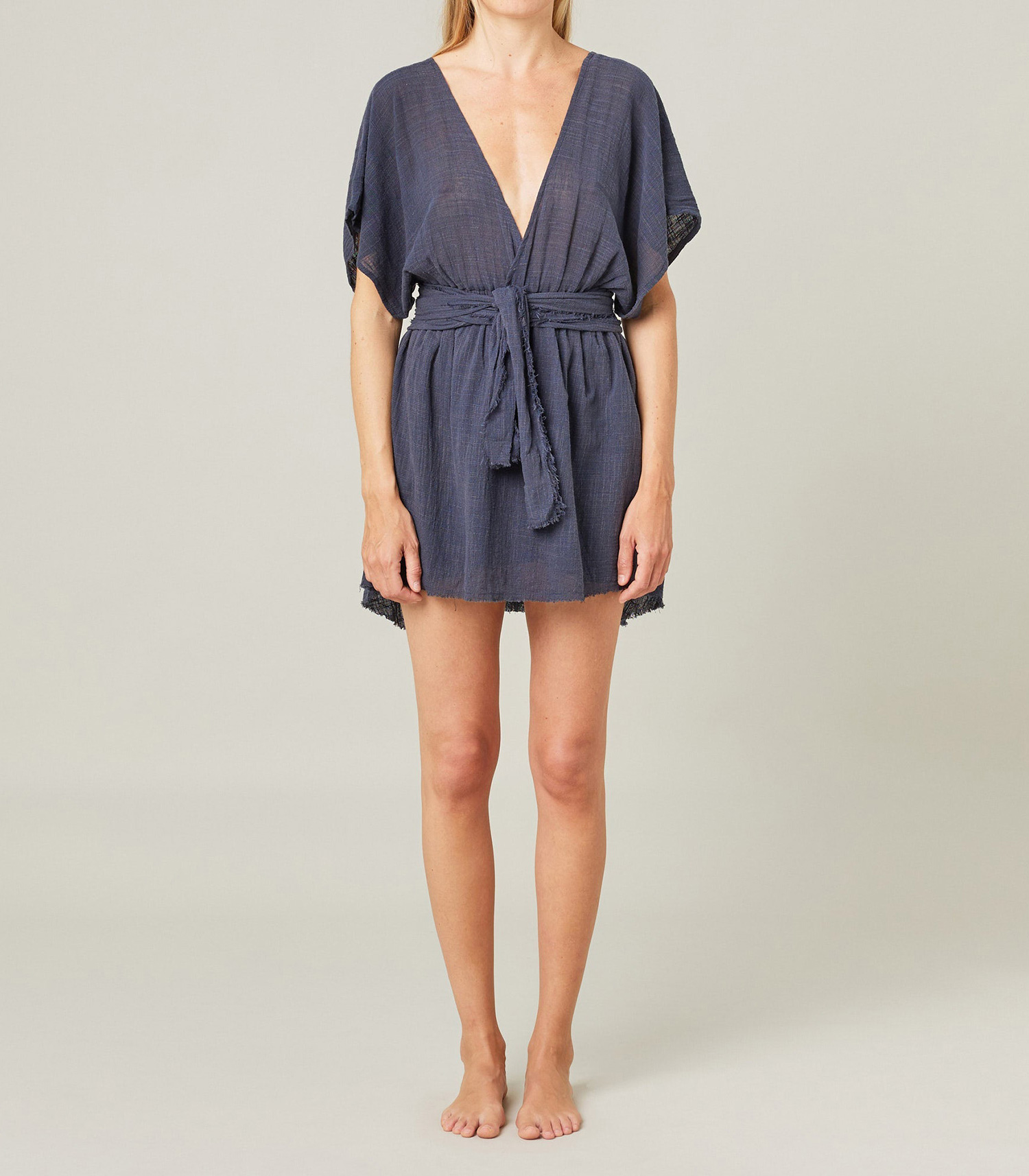 La robe courte Empire dévoile un col V, des manches chauve-souris et une taille haute sous poitrine élastiquée. Le coloris bleu marine et la mousseline de coton texturé confèrent à ce modèle fabriqué à Bali par un atelier familial et traditionnel un aspect léger et aérien. Une ceinture longue et amovible à bords francs est à nouer à la taille.