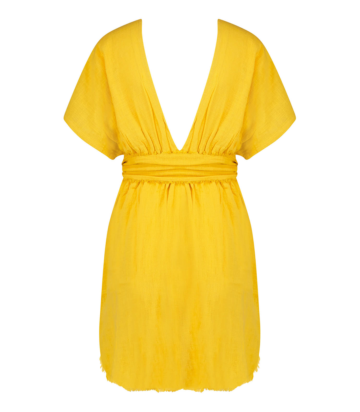 Robe courte Empire Gold de la Maison Saint Julien, entièrement conçu en coton froissé léger et aérien. Cette robe à la coupe babydoll met en valeur la silhouette et la poitrine pour une allure féminine. Cette pièce est fabriquée à la main à Bali, par un atelier local et familial, dans le respect du savoir-faire traditionnel. Une pièce parfaite pour enfiler par-dessus son maillot après la plage.