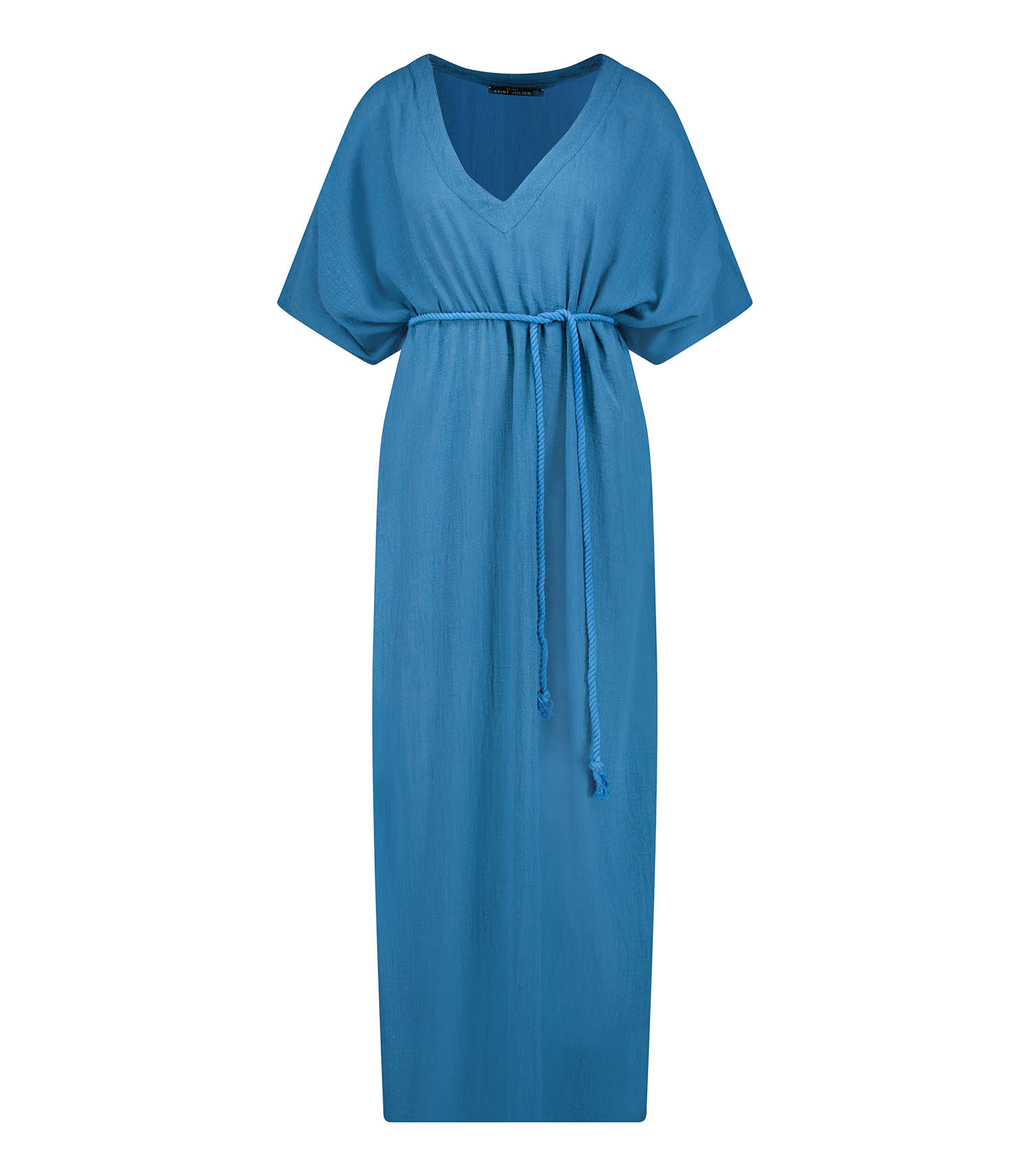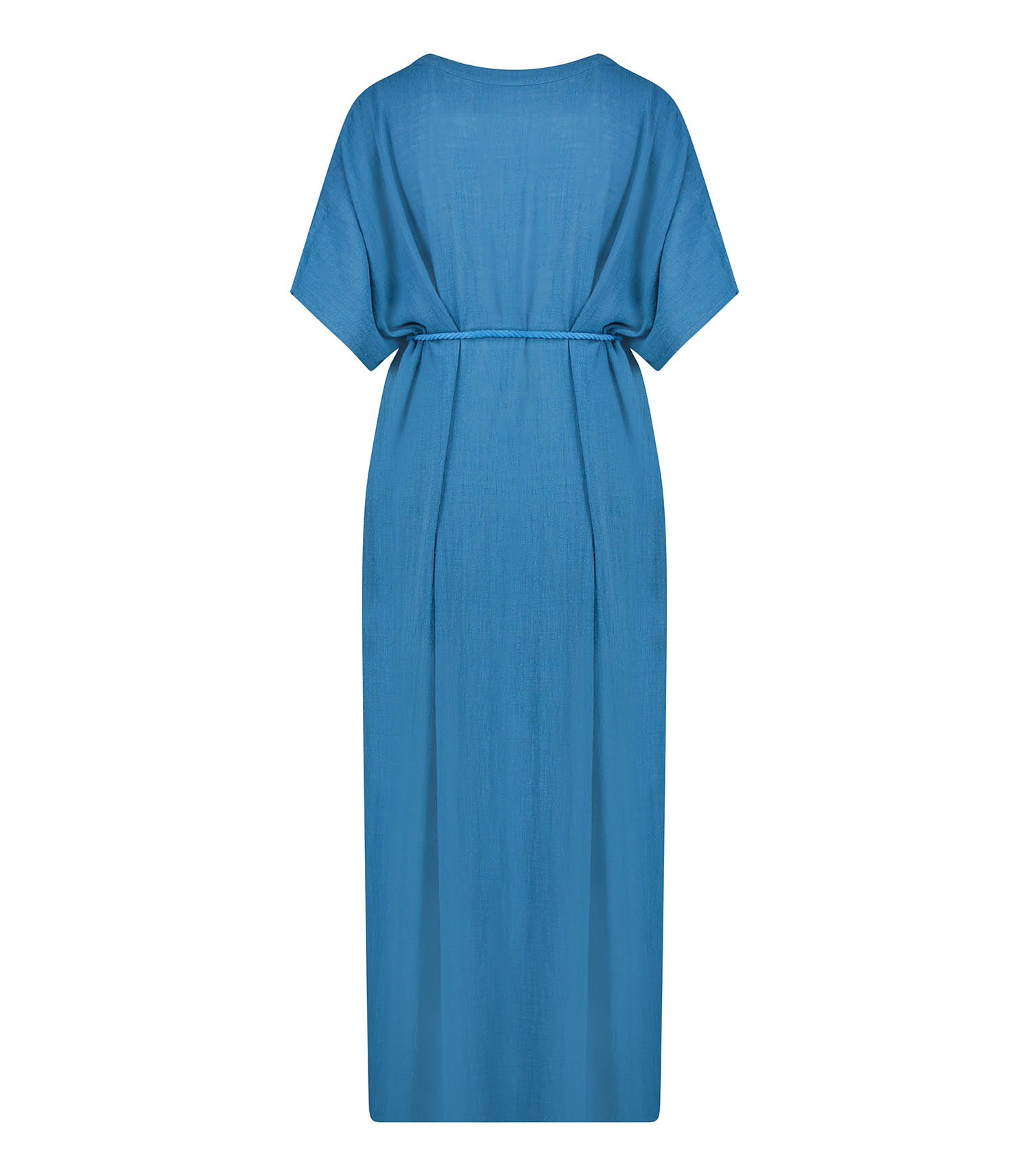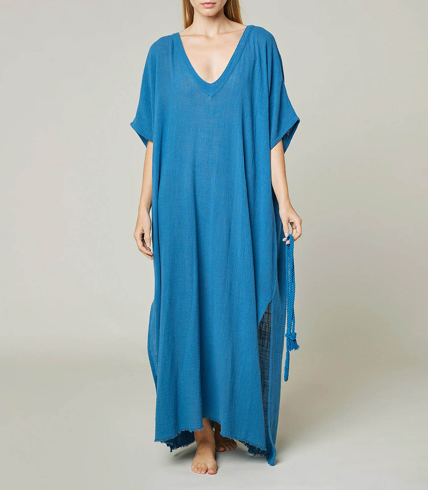 Robe kaftan Palma de Mallorca Pétrole e de la marque Maison Saint Julien. Conçu en gaze de coton à la fois doux et texturé, ce modèle de kaftan se porte comme tel ou ceinturé au niveau de la taille afin d'équilibrer les volumes. Une pièce bohème et estivale.