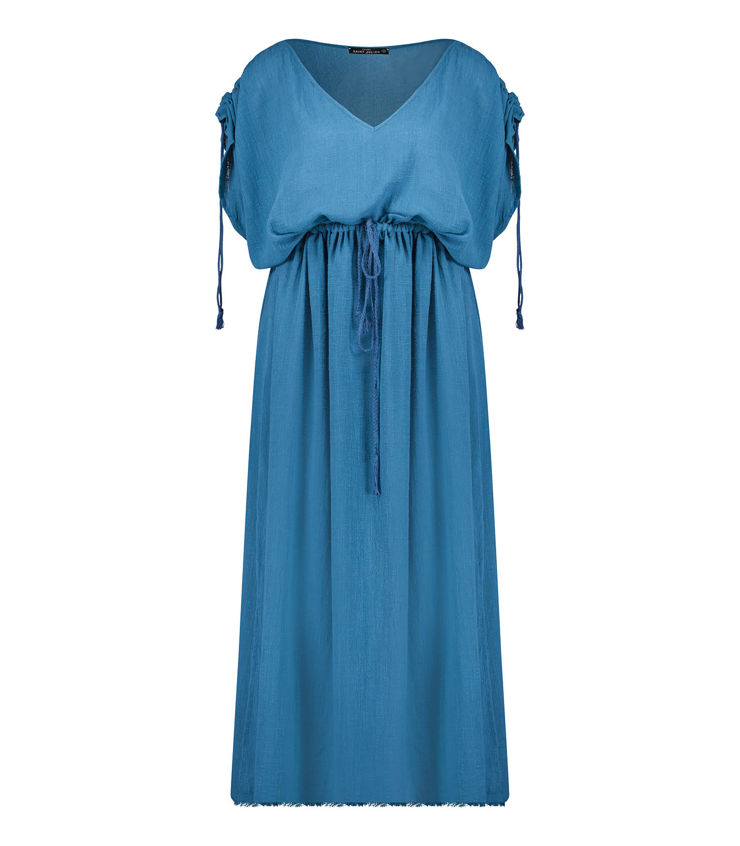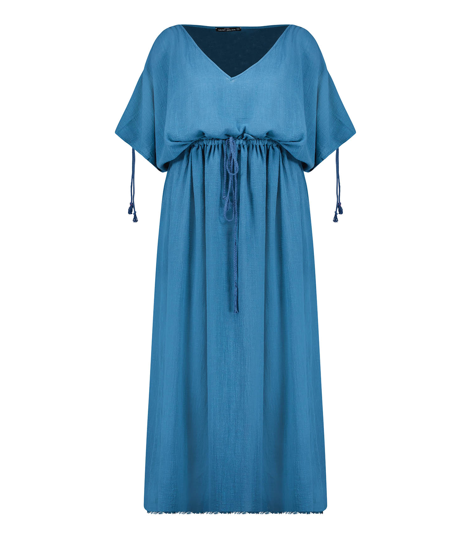 Robe longue Alexandrie Pétrole de la marque Maison Saint Julien, une robe kaftan conçue en mousseline de coton texturé qui allie légèreté et confort. Un modèle aérien idéal pour l'été.