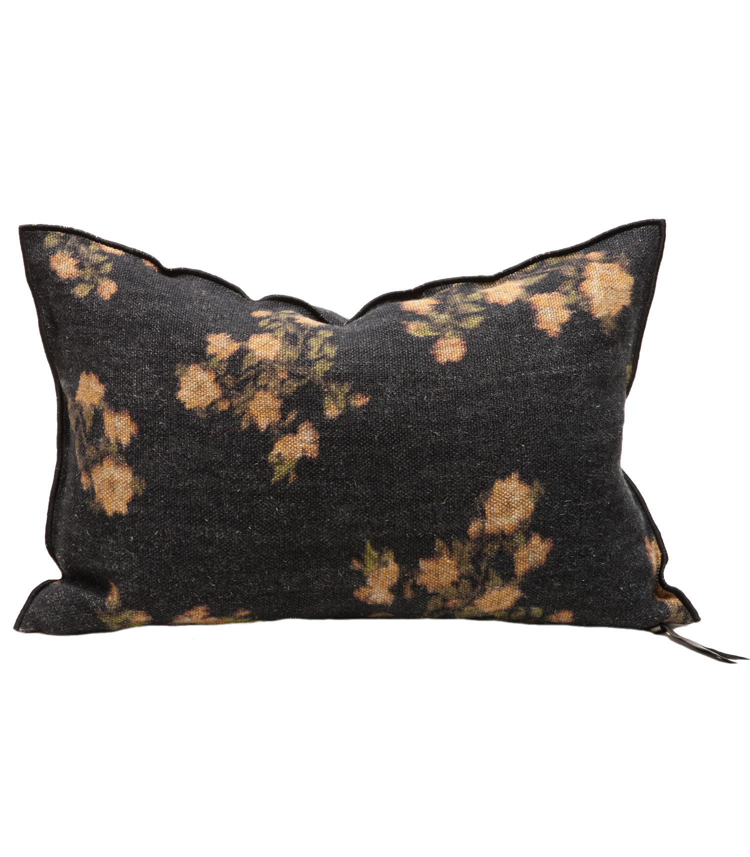 Coussin Vice Versa Lin Wabi-Sabi 40 x 60 cm de la marque Maison de Vacances. Coussins en lin épais d'aspect texturé, coloris de fond carbone. L'impression représente des fleurs avec un esprit vintage délavé. Petit lien en cuir lamé champagne en finition à la fermeture éclair. Vendu avec garniture.