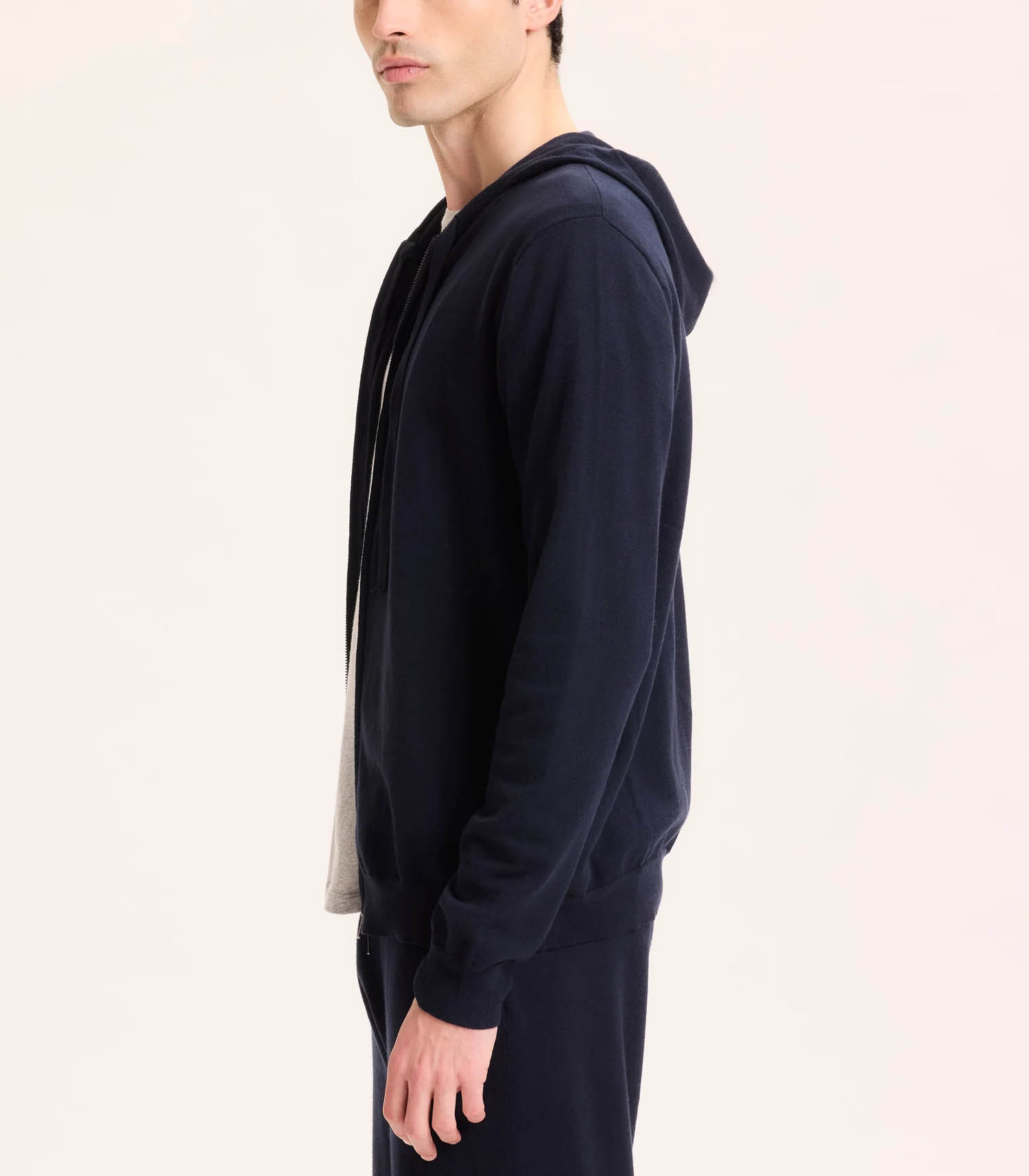 Gilet Marine Col Capuche Manches Longues en Coton Organique signé Majestic Filatures.