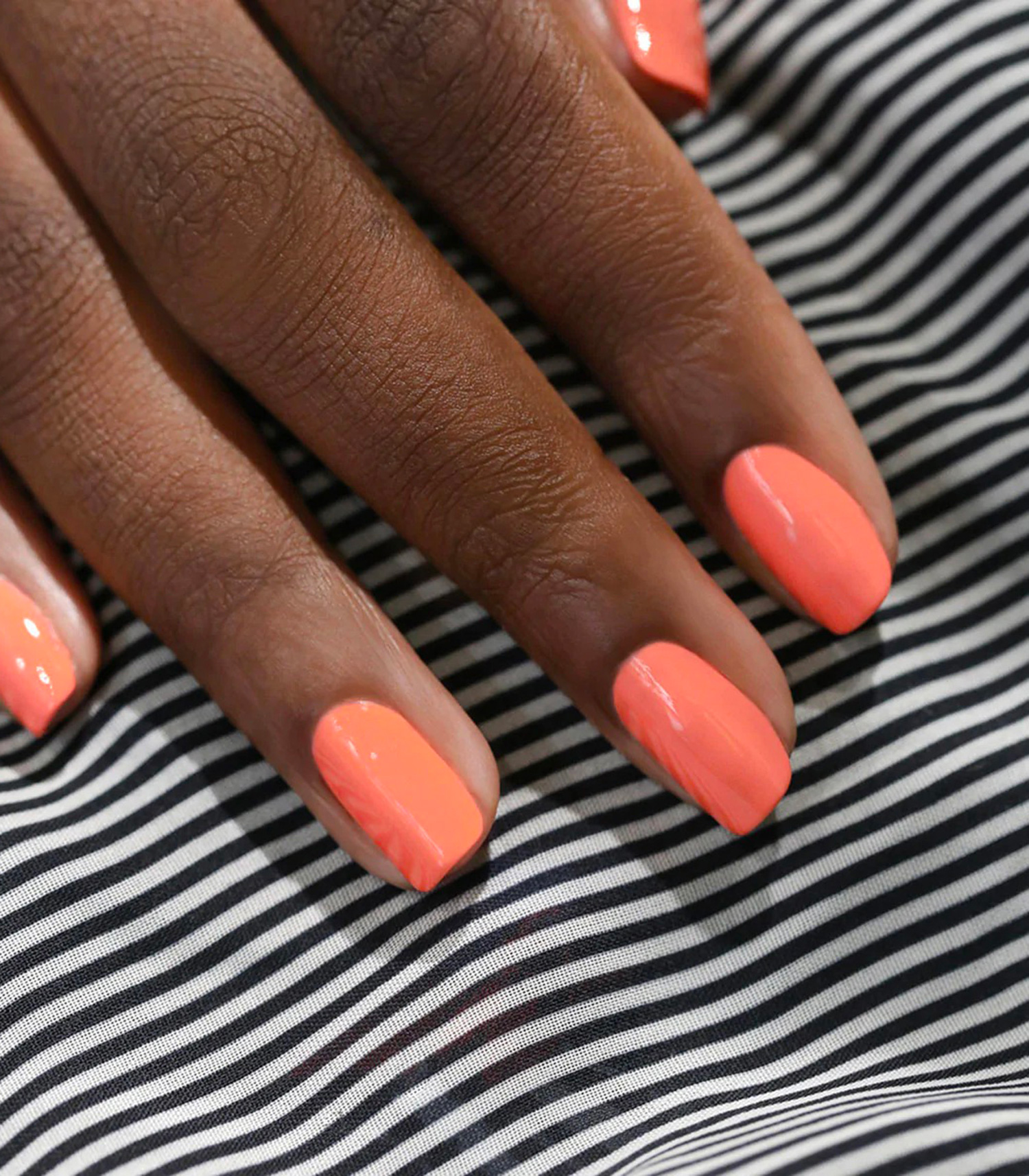 Vernis à ongles Green Bird of Paradise de la marque Manucurist, un orange corail doux et éblouissant aux reflets rosés.