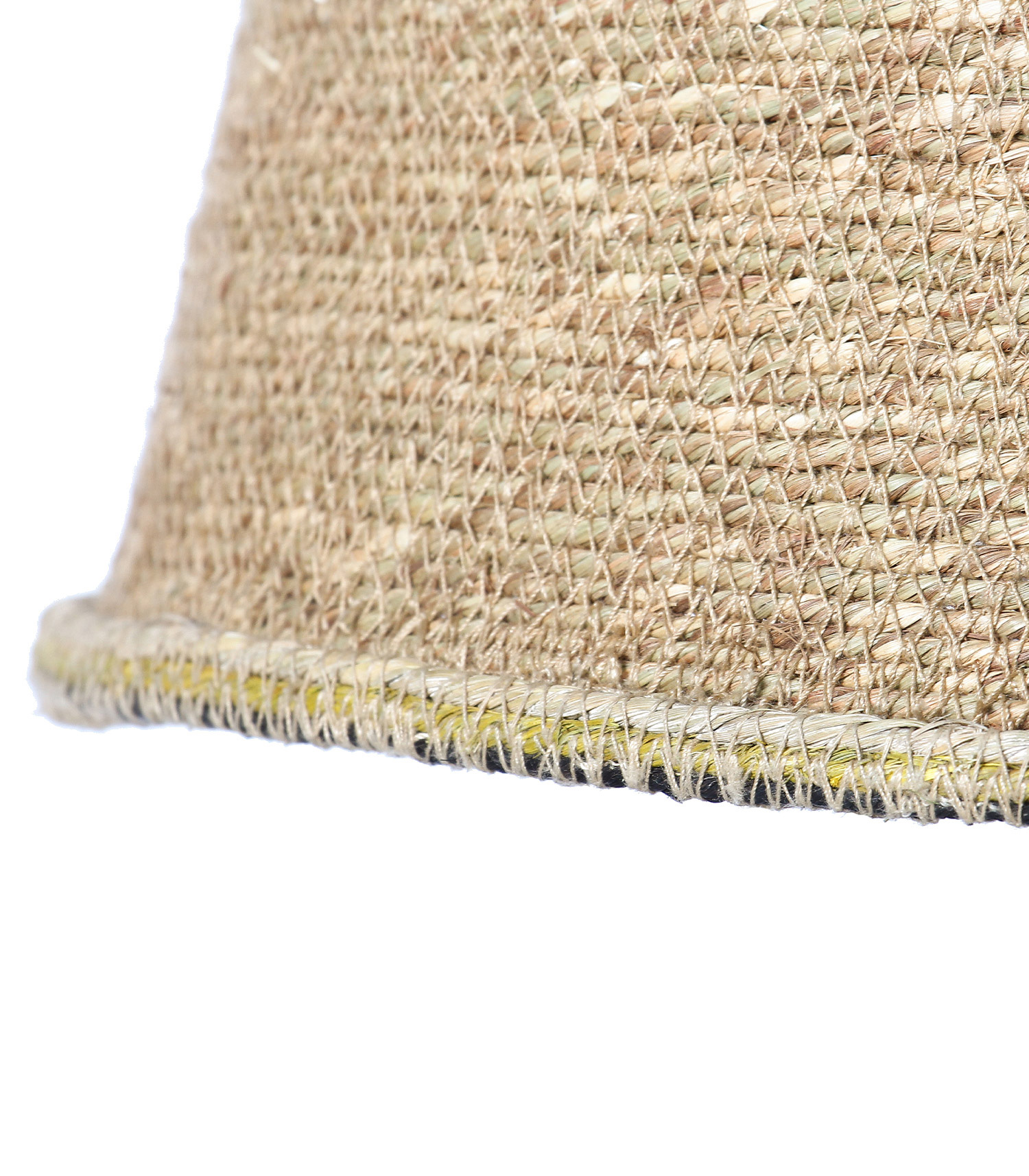 Suspension large en jute beige Bohème Manufactori. Formée telle un dôme, elle se compose d'une toile de jute beige et de liserés noir, jaune et kaki sur le bas. Une suspension qui participe à créer un univers bohème, naturel et chaleureux.