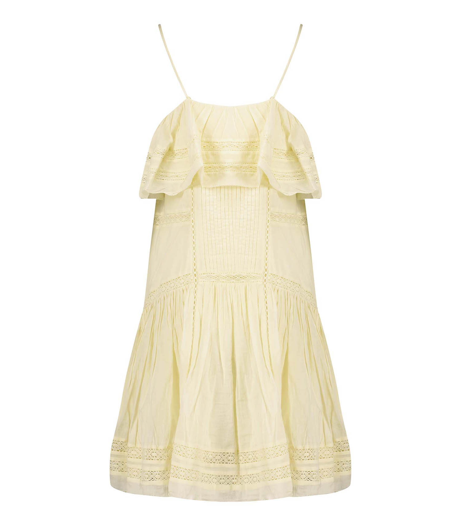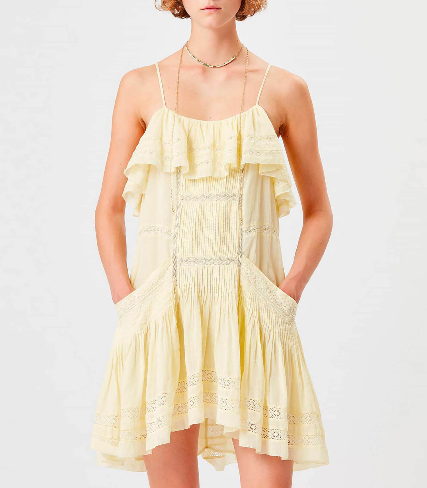 Petite robe d'été en coton Moly Yellow signée Isabel Marant, un modèle trés féminin avec ses bretelles spaghetti, empreint d'un charme bohème avec ses multiples volants et broderies à l'anglaise.