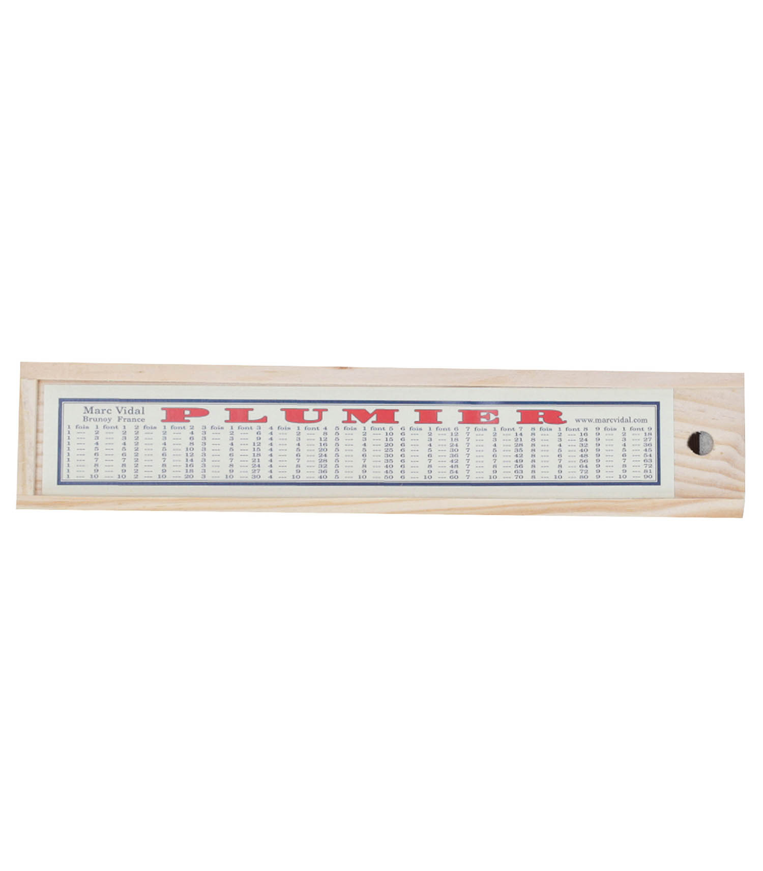 Plumier en bois composé de 8 Crayons de Couleur de la marque Marc Vidal. Le couvercle de la boîte affiche les tables de multiplication d'un côté et une règle de l'autre.