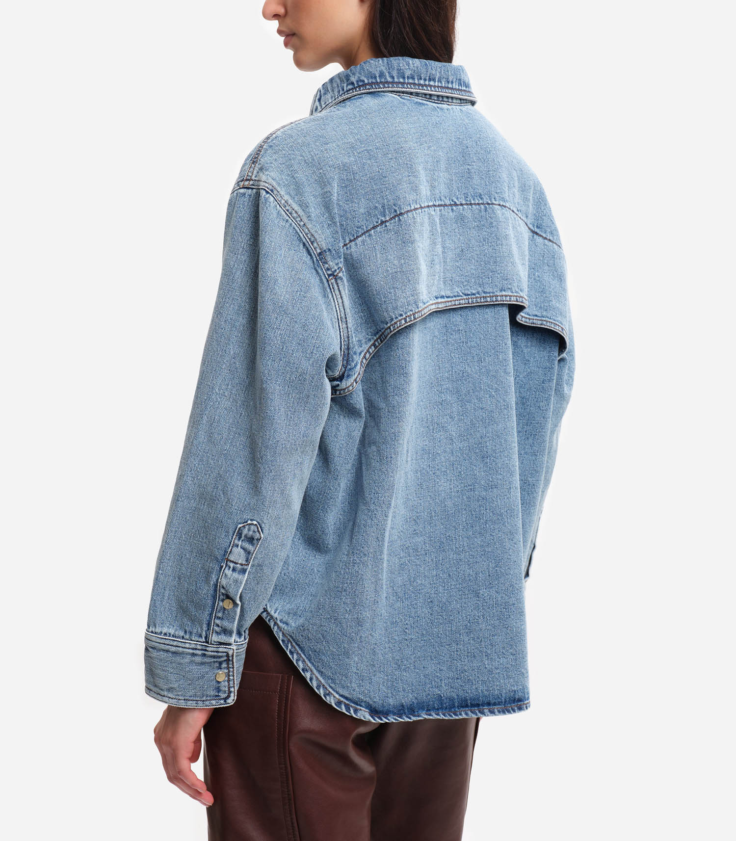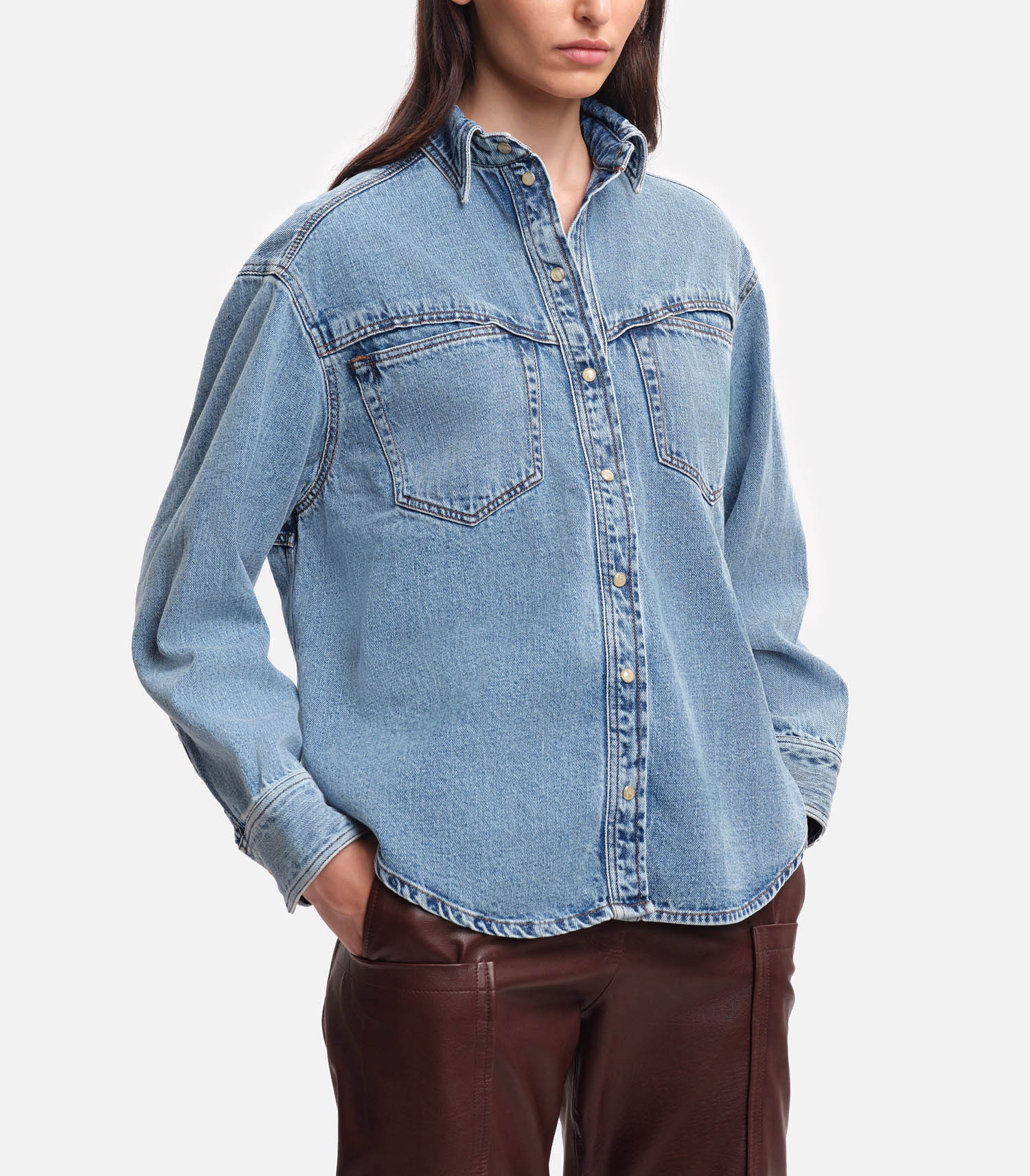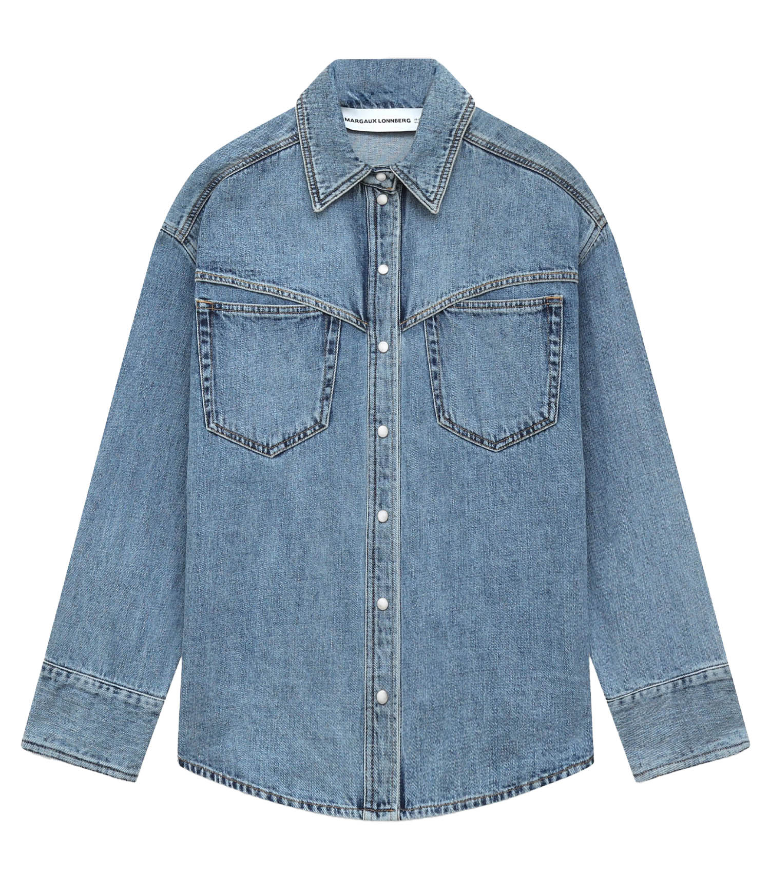 Chemise Blake Margaux Lonnberg inspirée des coupes vintage, cette chemise en denim revisite l’esprit western avec justesse. Son col pointu et ses pressions nacrées apportent une touche d’authenticité, tandis que sa coupe décontractée et son ourlet arrondi soulignent une allure moderne et effortless.