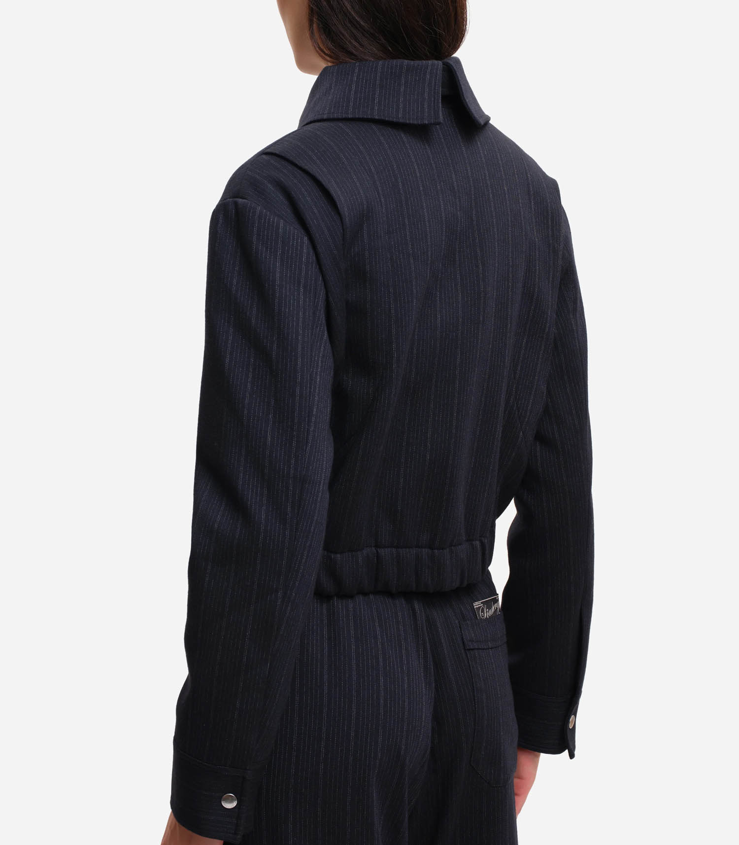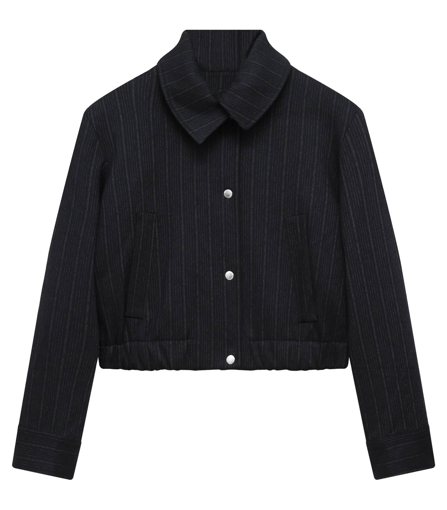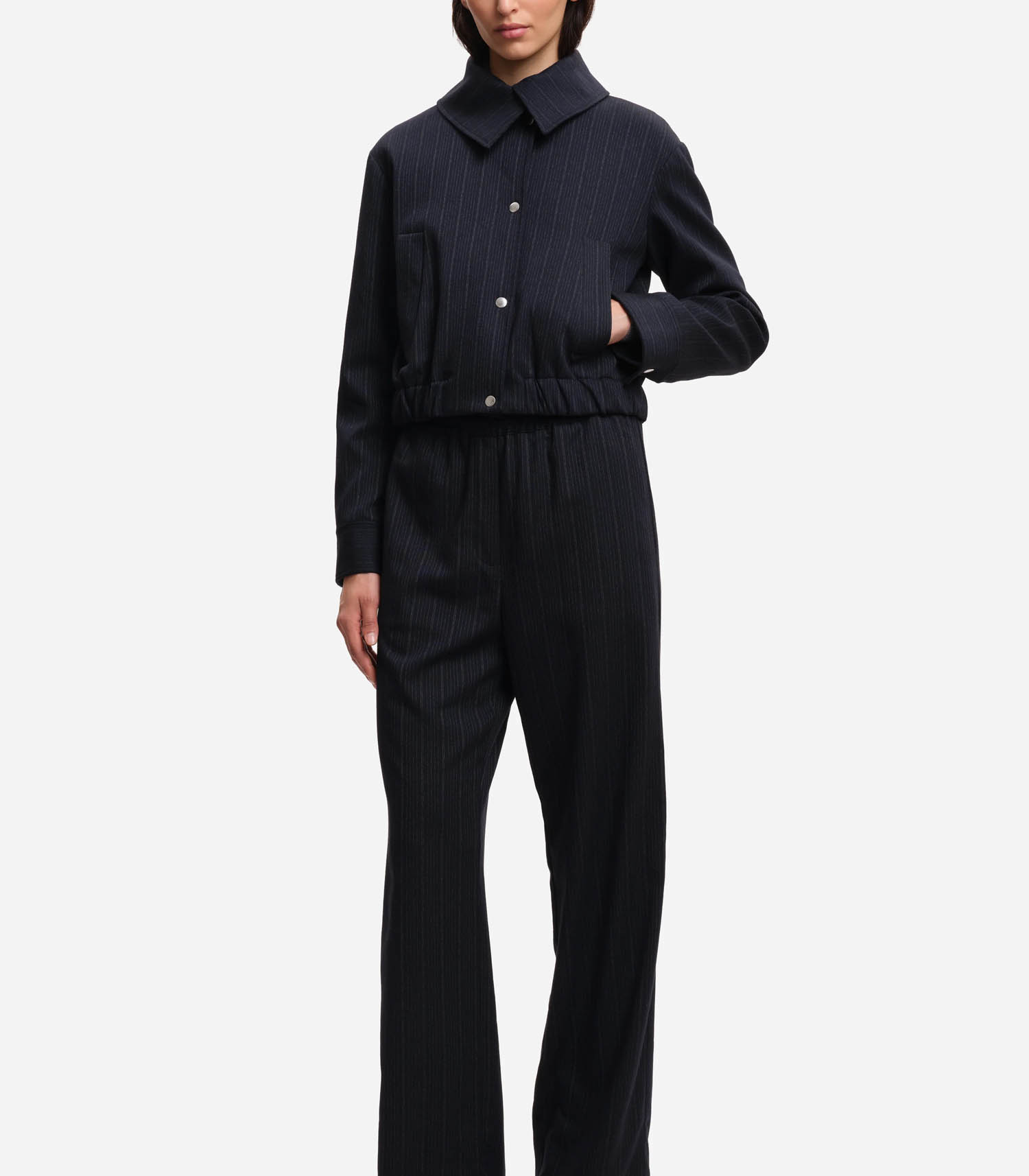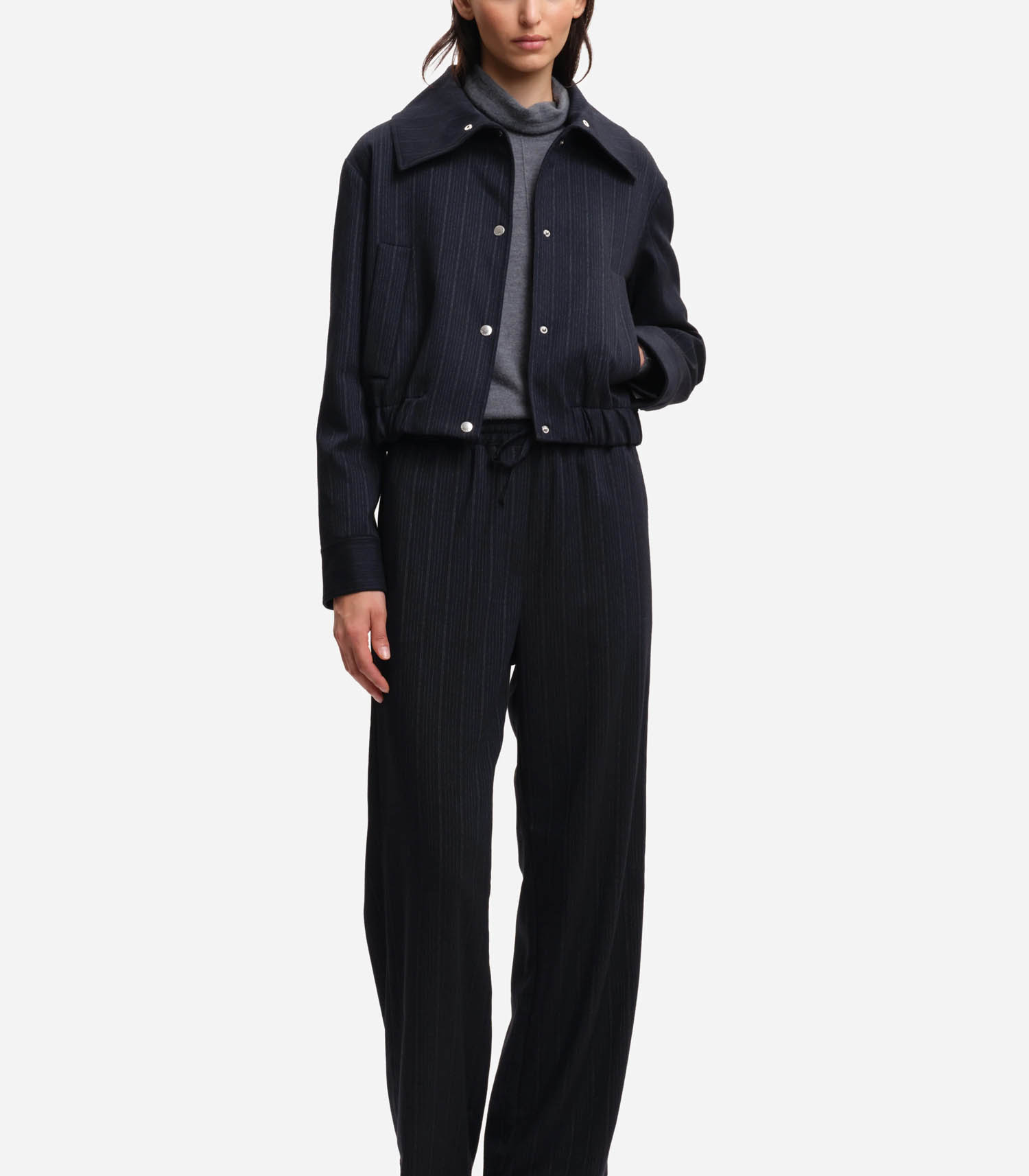 Veste Anja de la marque Margaux Lonnberg. Ce modèle incarne parfaitement le mix du style confortable et élégant avec sa coupe façon blouson et son tissus navy aux fines rayures claires.