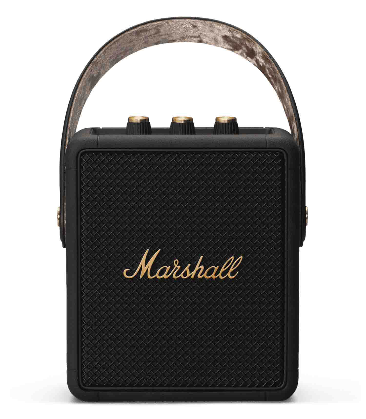 Enceinte Stockwell II Black and Brass signée Marshall, imposante par sa puissance malgré sa taille compacte. Portable, elle se transporte facilement grâce à sa poignée en cuir. Elle dispose d'une expérience multidirectionnelle pour une immersion complète, en intérieur comme en extérieur.
