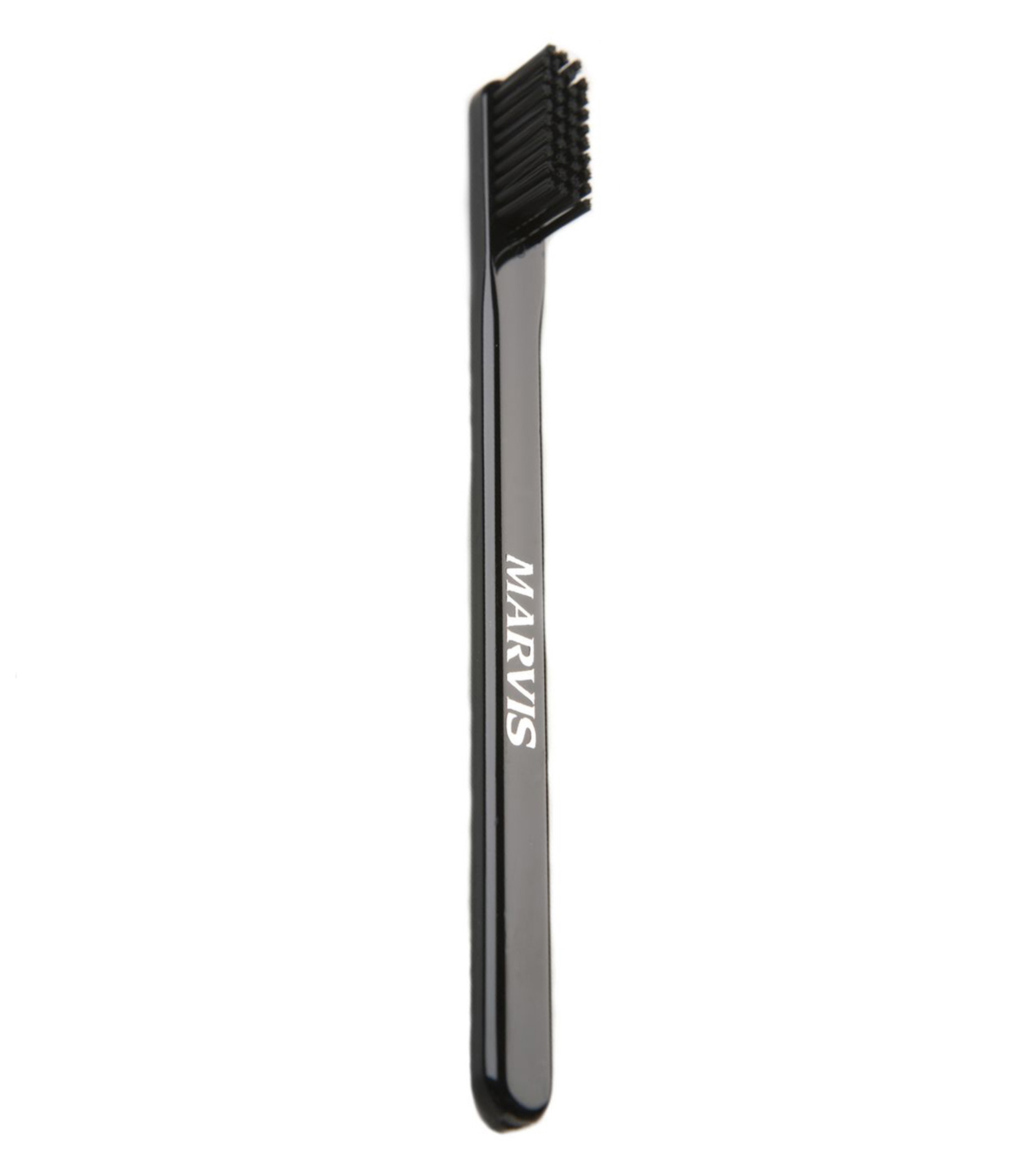 La brosse à dents Marvis avec son étui protège votre plus bel atout charme : votre sourire. Son design de caractère inclut un manche noir avec le nom de la marque en lettres d’argent et des poils noirs de dureté Medium.