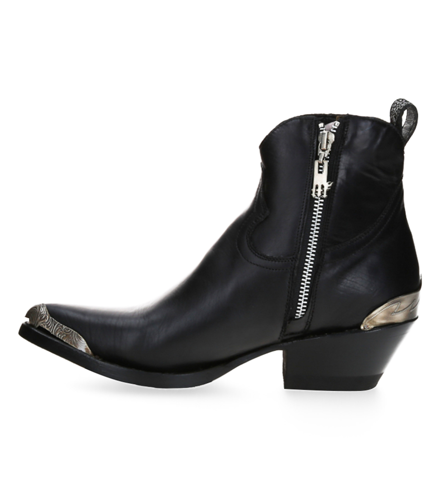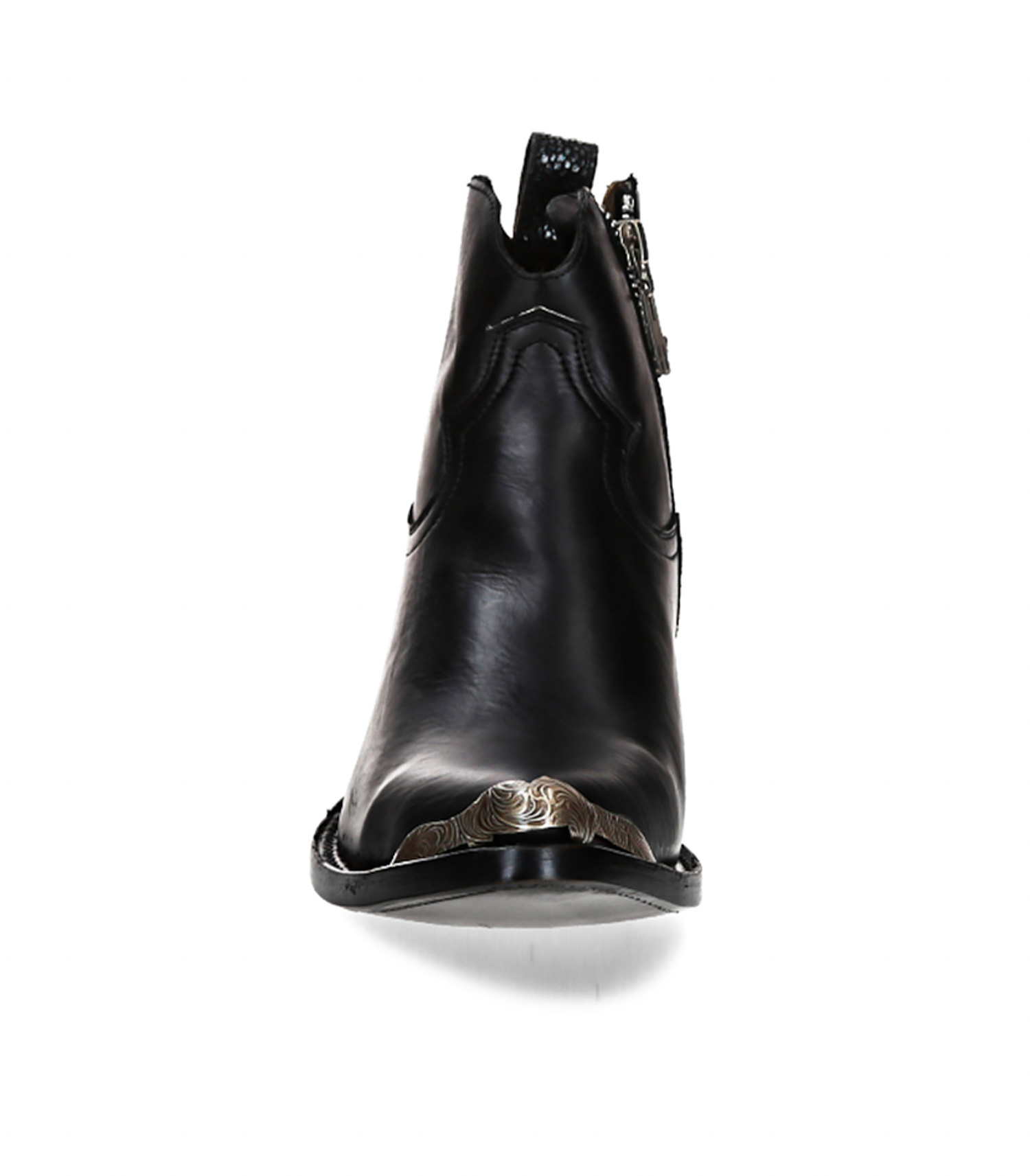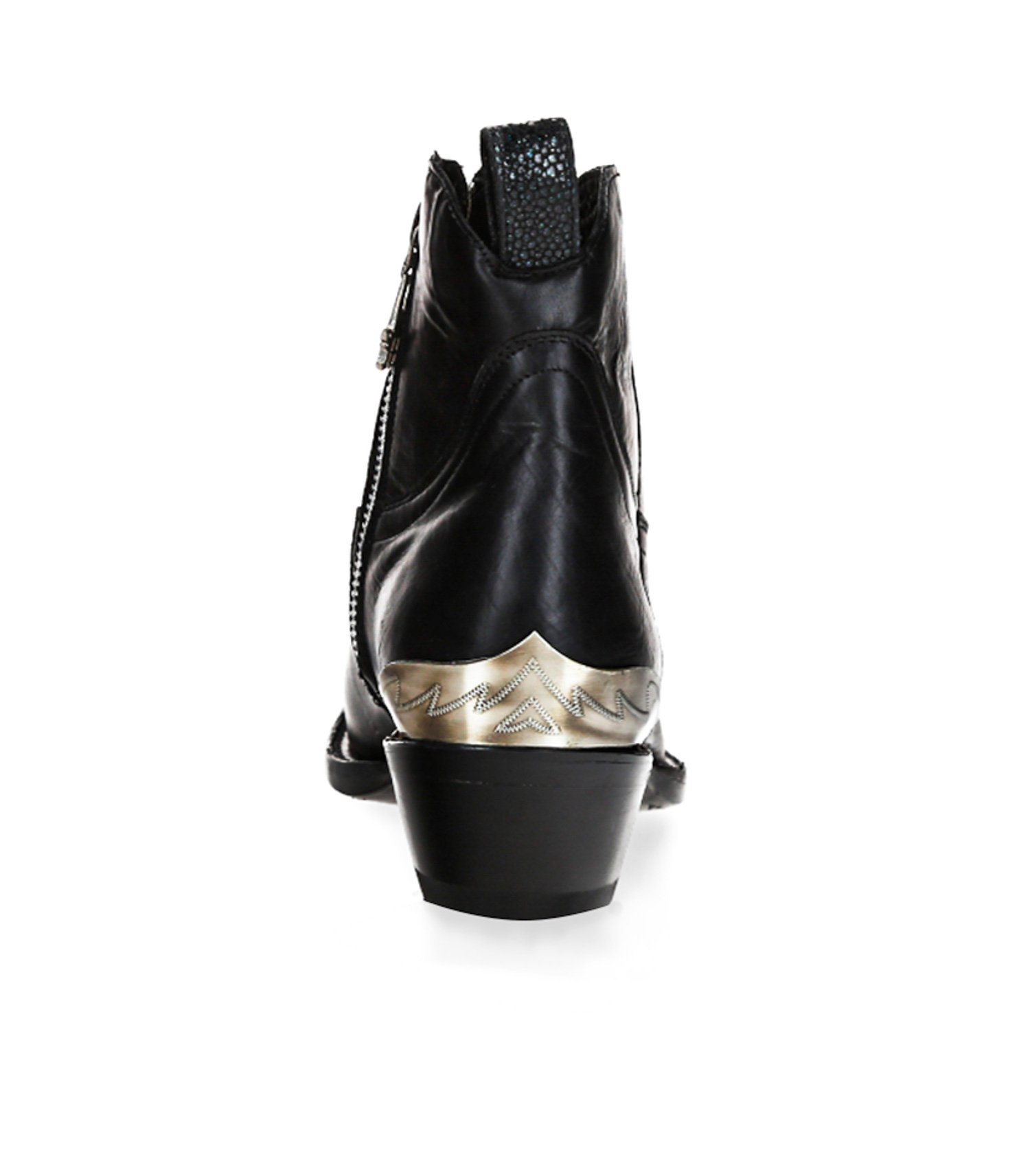 Les Boots Maya Becerro Negro en cuir lisse de la marque Mexicana comportent un talon biseauté et un bout pointu et sont aggrémentées d'un embout métallique façon santiags à l'avant et à l'arrière du pied. On retrouve également une languette facilitant l'enfilage de la chaussure à l'arrière.