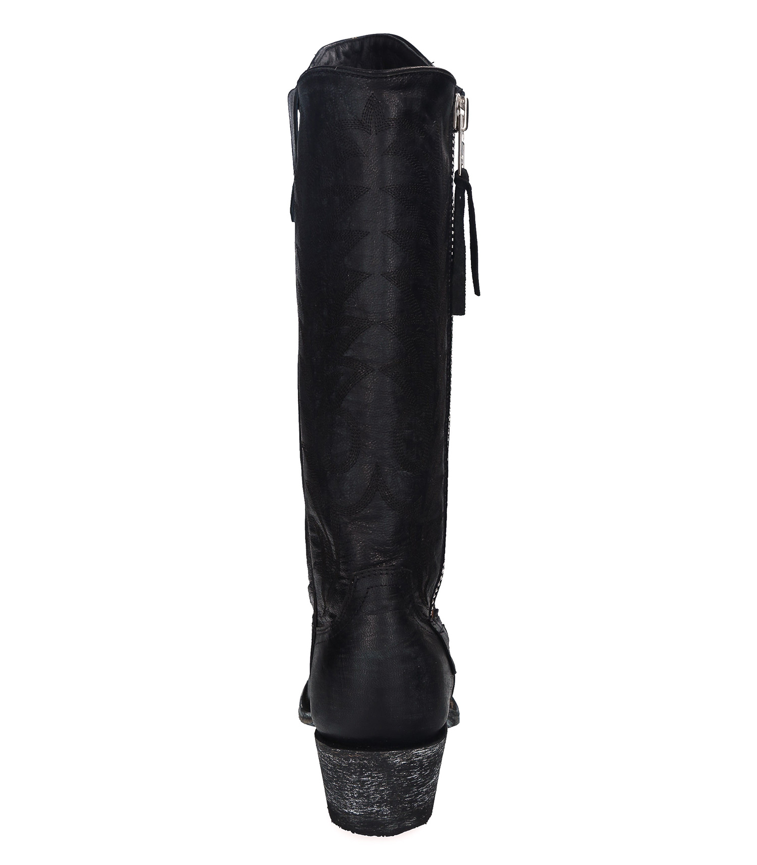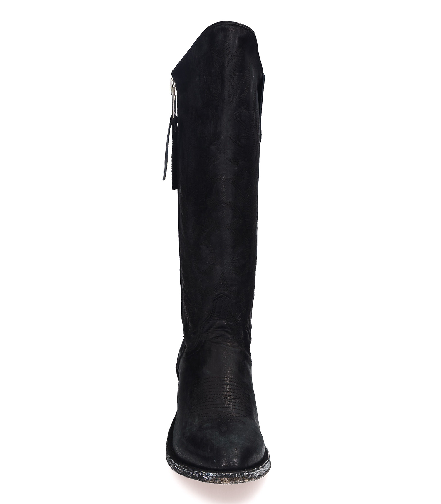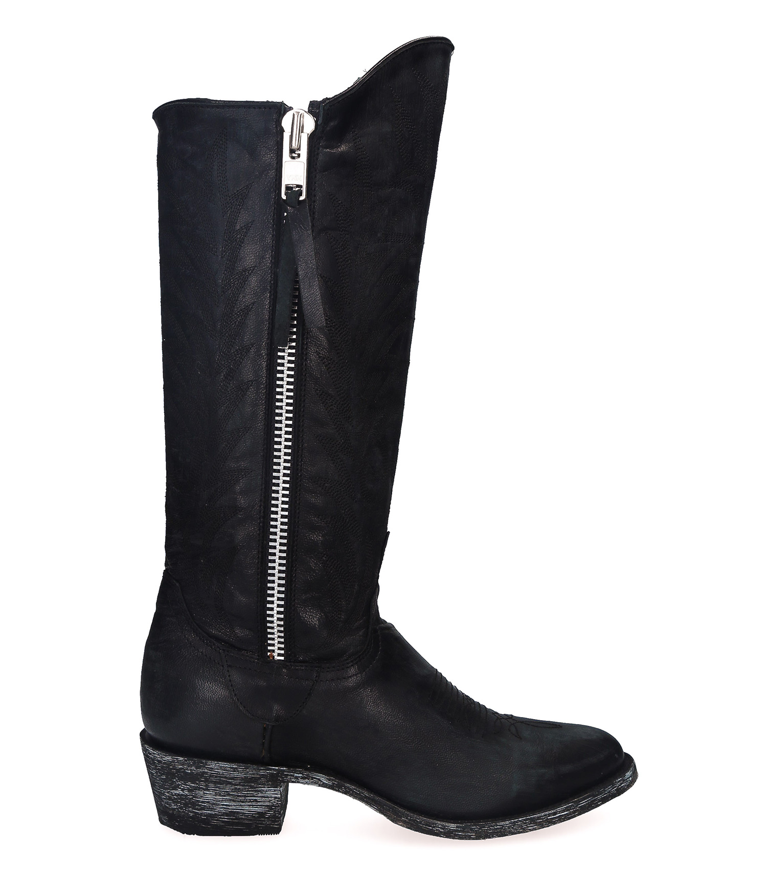 Boots santiag Mexicana, modèle Razz 13 en coloris Black Vesuvio : la santiag haute par excellence, dans une teinte noire ultra-élégante à broderies décoratives ton sur ton. Cette paire de boots a été réalisée en exclusivité pour Jane de Boy, avec une fermeture zippée sur l'extérieur du pied, qui en fait un élément détonnant.