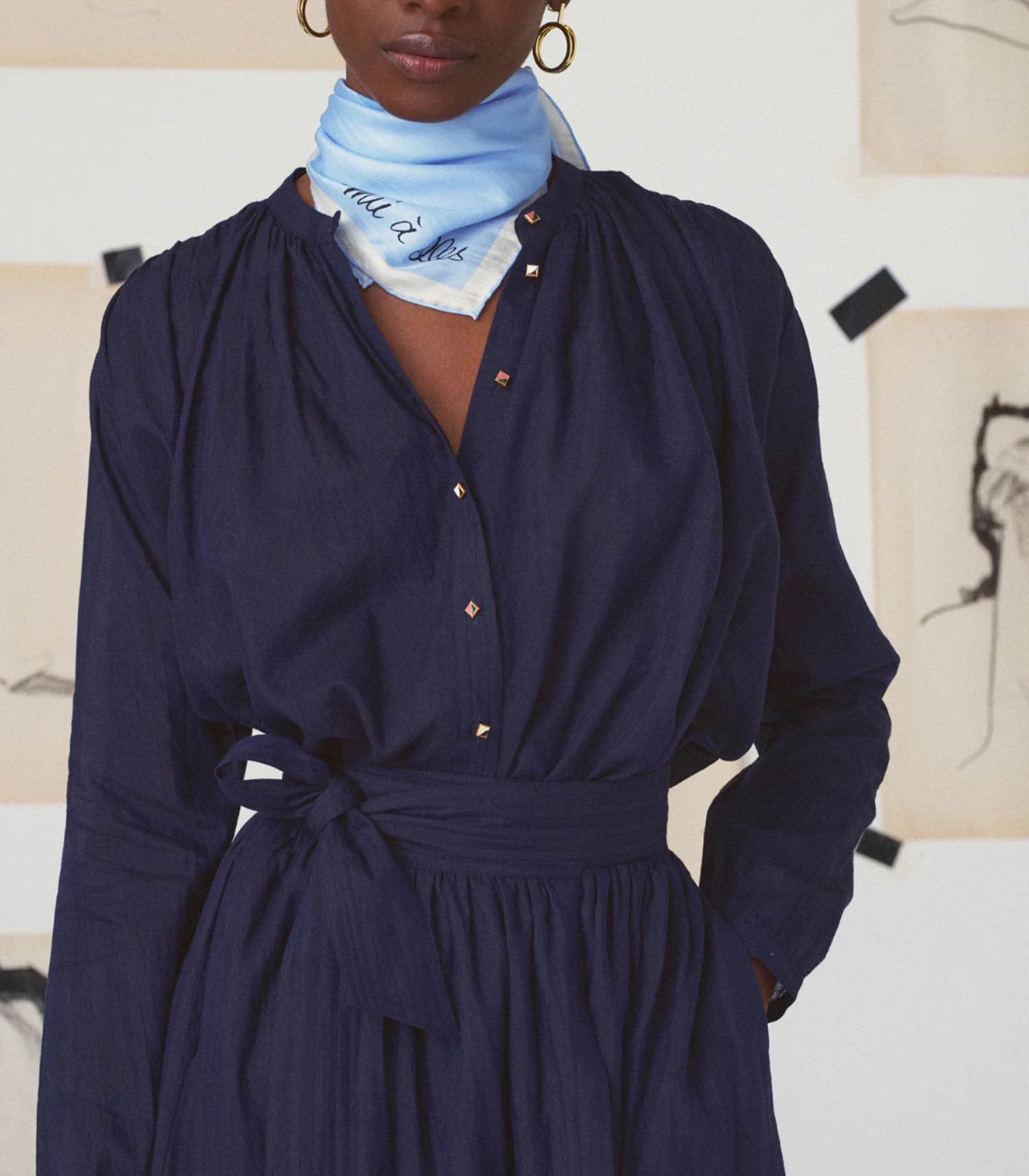 Elle existe en coloris bleu-gris et marine, deux variantes qui soulignent sa texture chatoyante tout en lui conférant une allure à la fois élégante et facile à assortir.