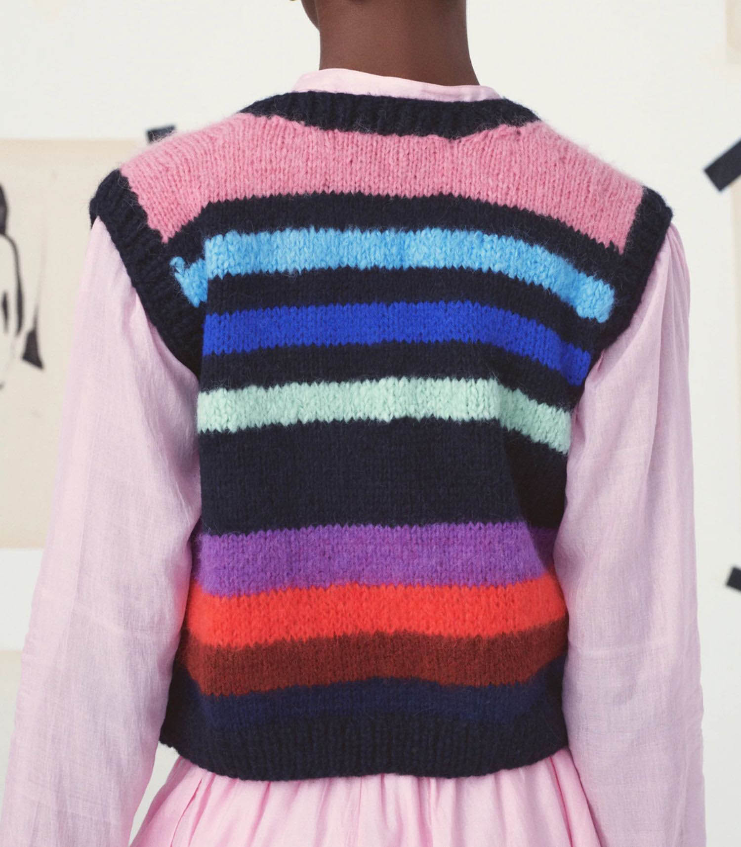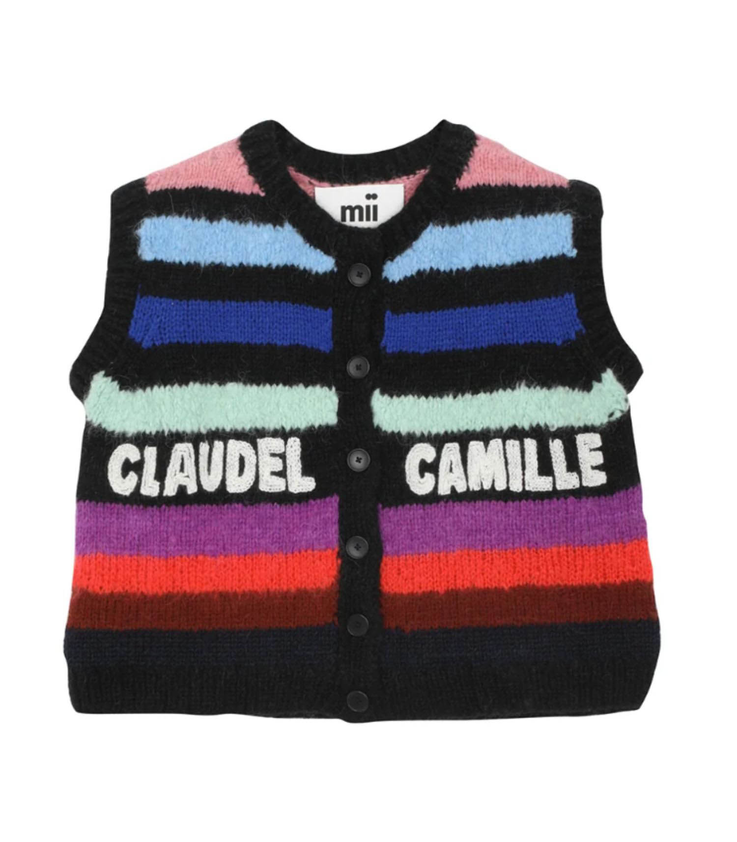 Gilet Claudel de la marque Mii. Le cardigan Claudel – Statement de Mii Collection est un petit pull court multicolore tricoté entièrement à la main. Fait d’un mélange de 70 % laine et 30 % alpaga, il offre chaleur, texture moelleuse et confort tout en restant léger. Sa coupe courte permet de le porter aussi bien sur des tailles hautes que sous une veste plus ample pour jouer les superpositions.