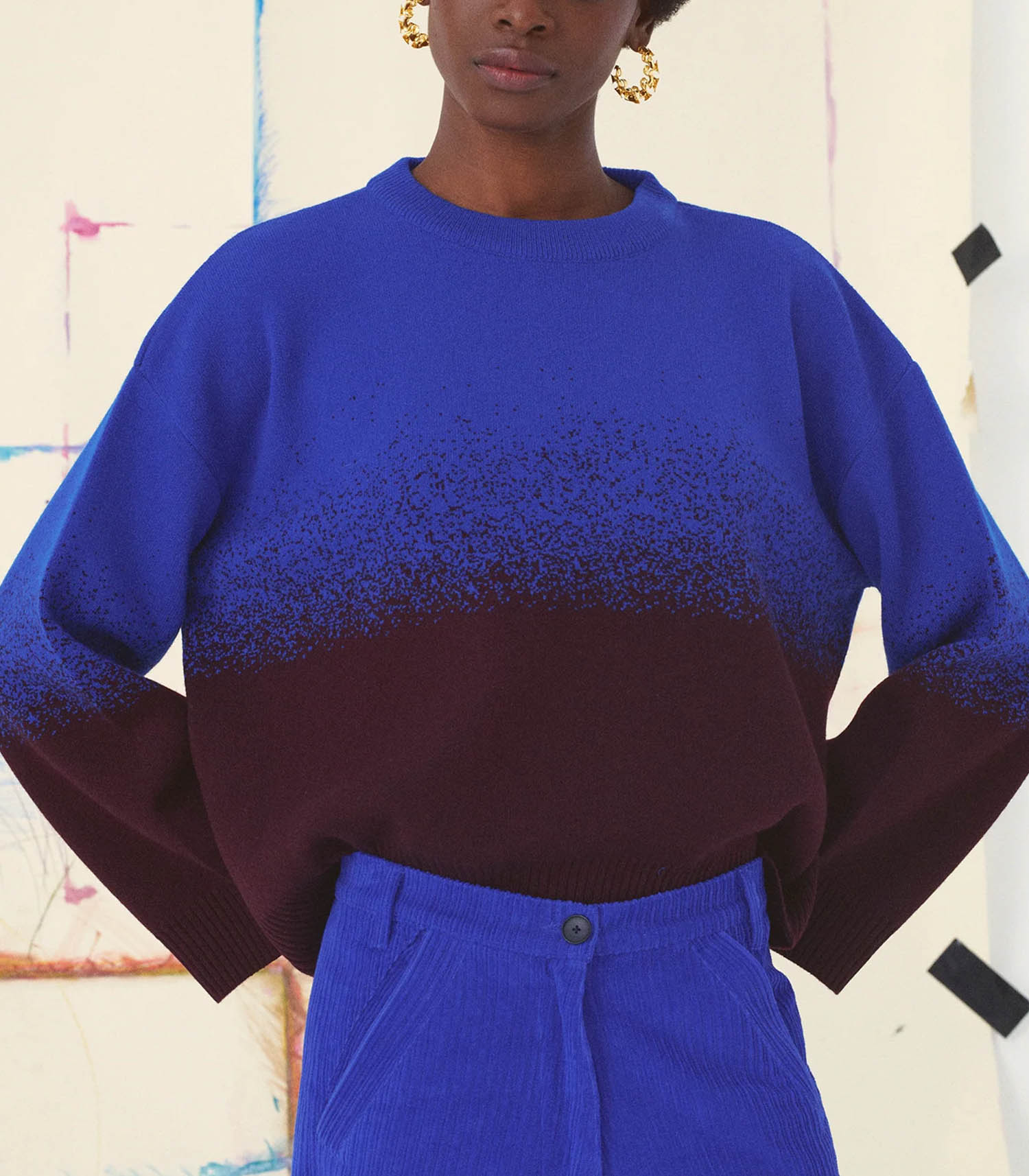 Pull Jumper Gerda L'Abstraction signée Mii. Comme une vue microscopique, il nous plonge dans les couleurs d'un tableau impressionniste. Ce pull en jacquard à une coupe légèrement oversize, il est en laine et en cachemire pour vous tenir chaud tout l'hiver. Décliné dans deux teintes chaudes : bleu et orange feu.