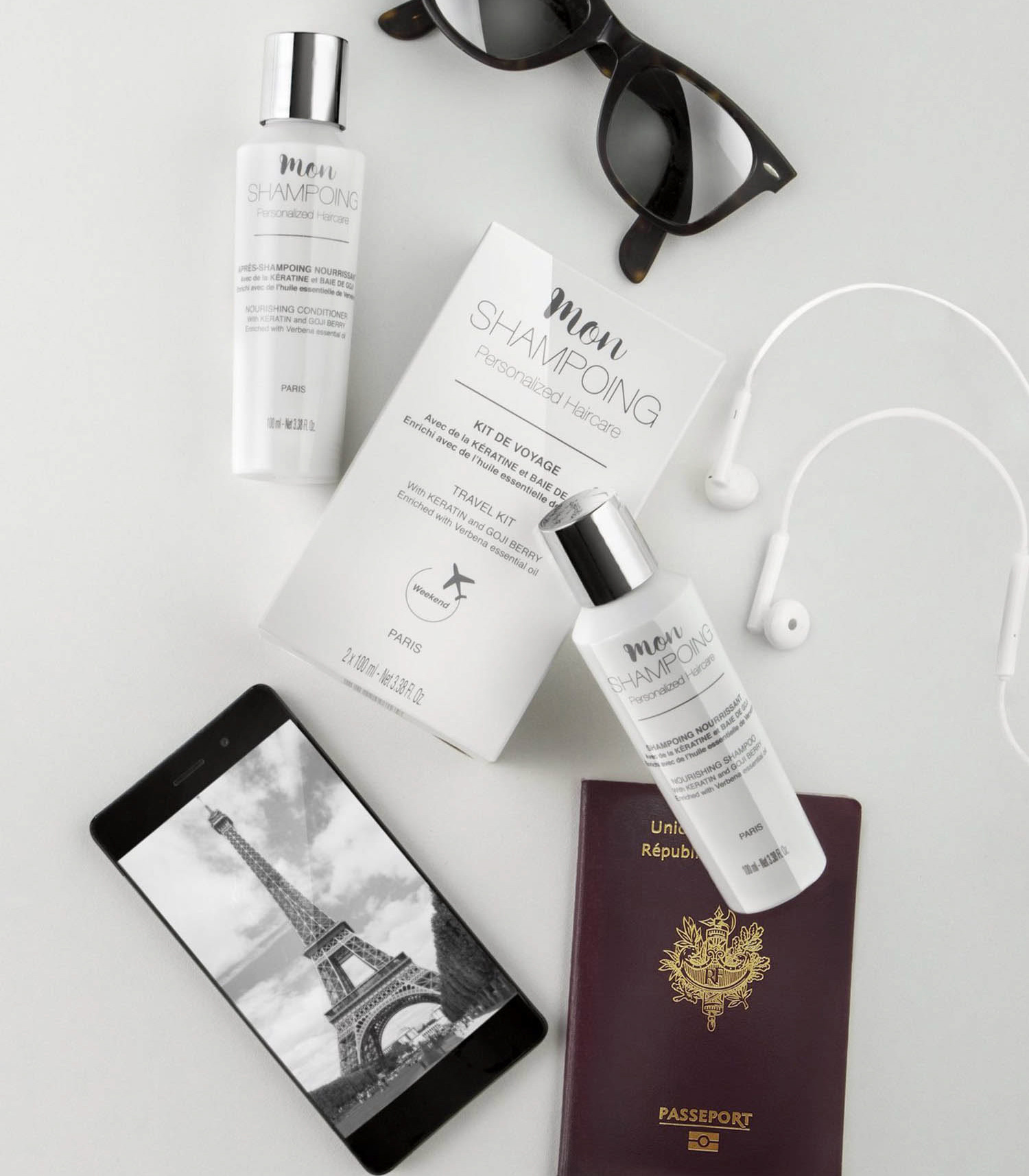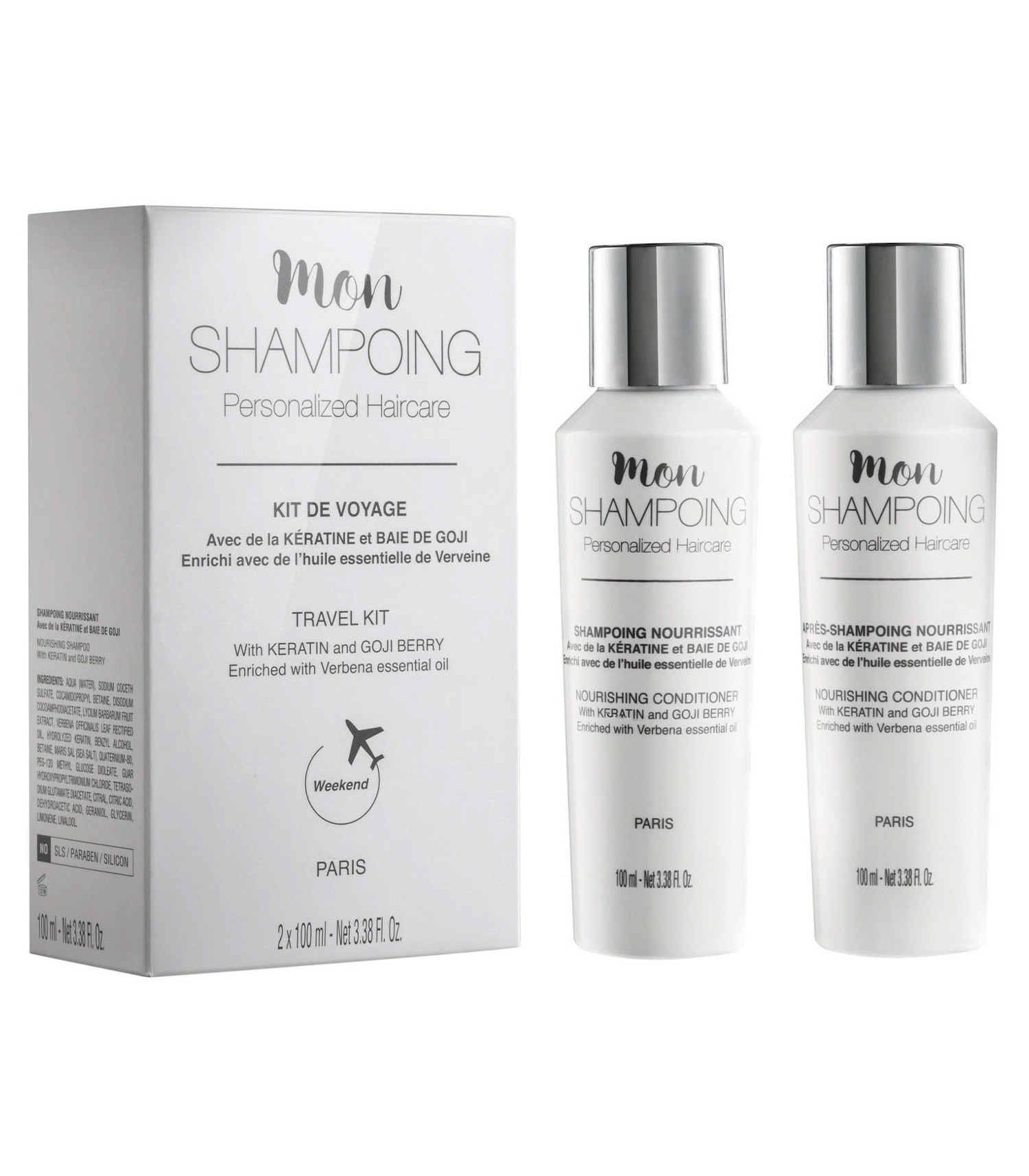 Voyagez léger avec votre valise cabine grâce Kit de voyage de la marque Mon Shampoing. Ce kit comprend un Shampoing et un Après-shampoing nourrissant avec de la kératine et baies de goji, enrichis avec de l'huile essentielle de verveine, au format règlementaire cabine de 100 ml.