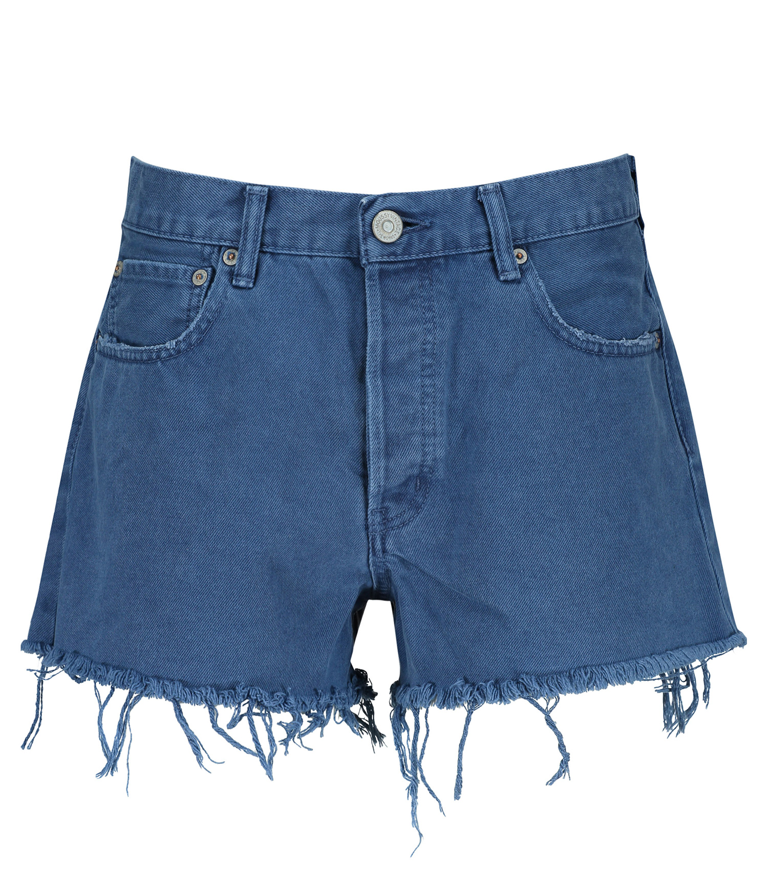 Short en jean Moussy Vintage de couleur bleu indigo et à bords francs.