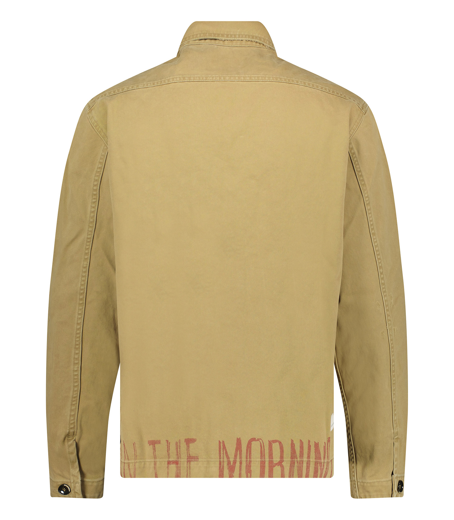 Veste en toile épaisse pour homme Andrea Camel de la marque Nine in the Morning, en coton camel rigide esprit workwear, coupe droite avec l'inscription "Nine in the Morning" en rouge en bas à l'arrière de la veste.