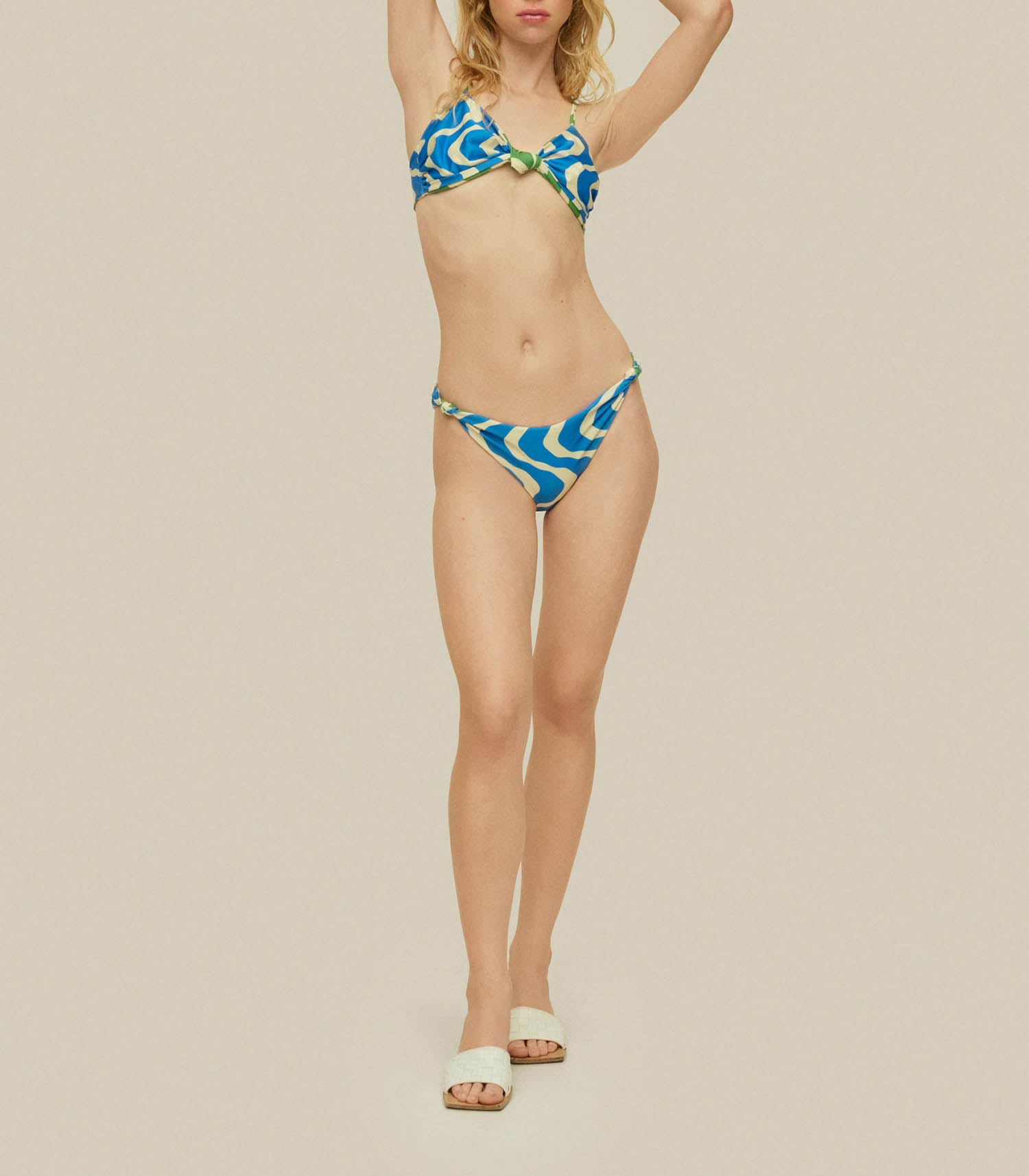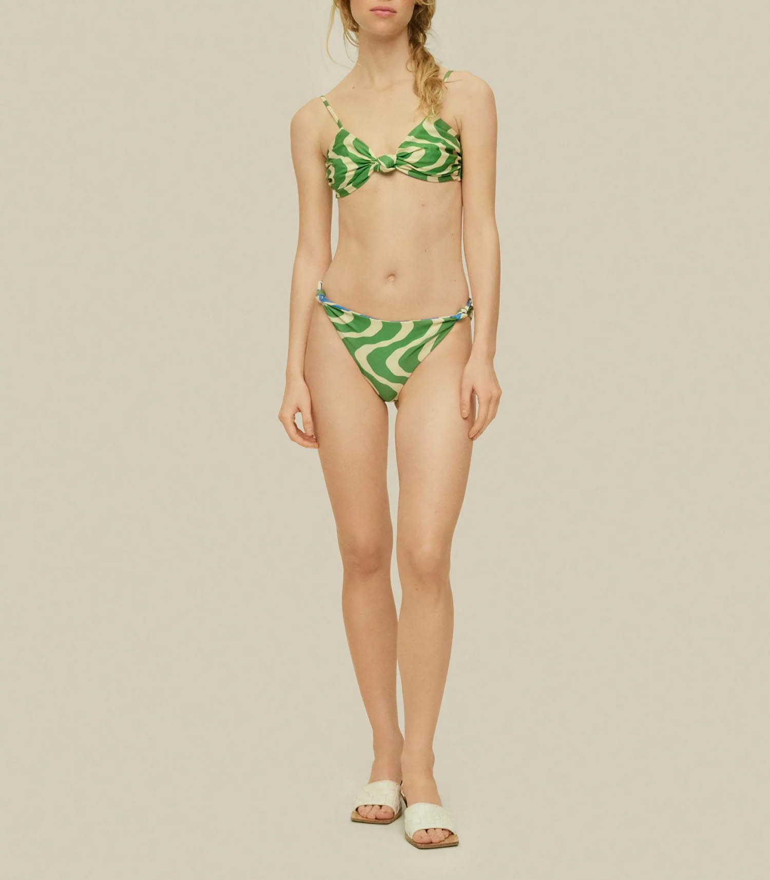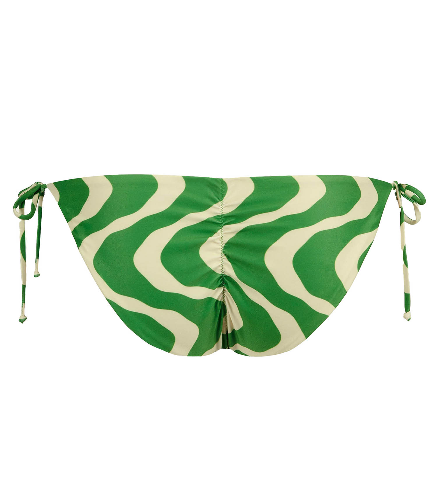 Bas de maillot de bain Rippling Azzura Green pour femme signé OAS. Un bas de bikini à nouer bas sur les hanches, orné d'un imprimé à rayures courbées façon seventies, dans des teintes vertes et beige. Fronce au dos pour mettre en valeur la silhouette. Tissu extensible anti-UV, 100% polyester provenant de déchets océaniques recyclés.