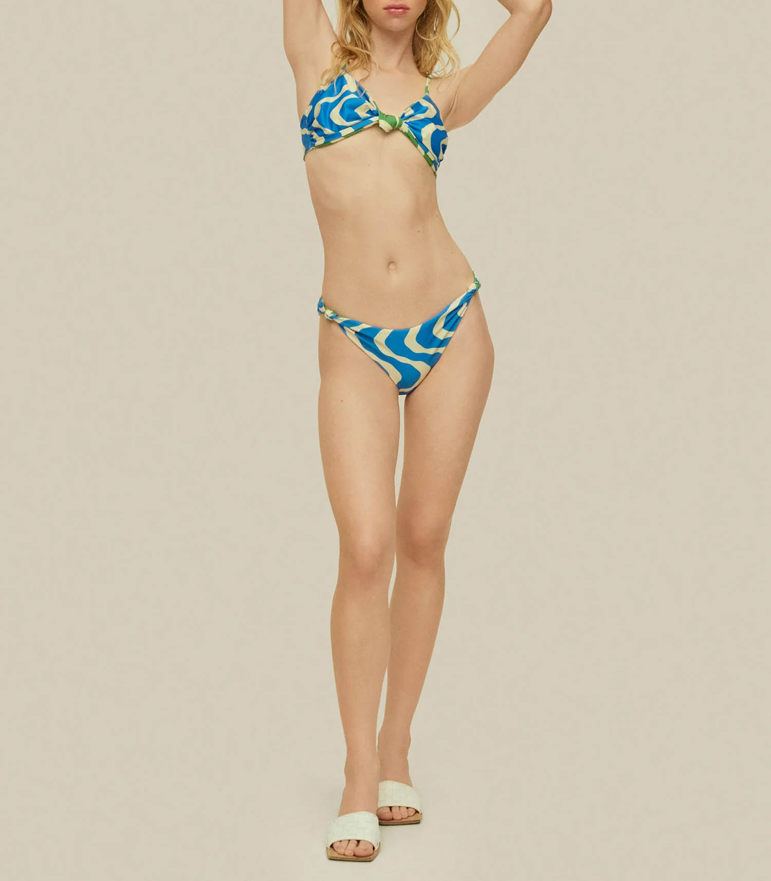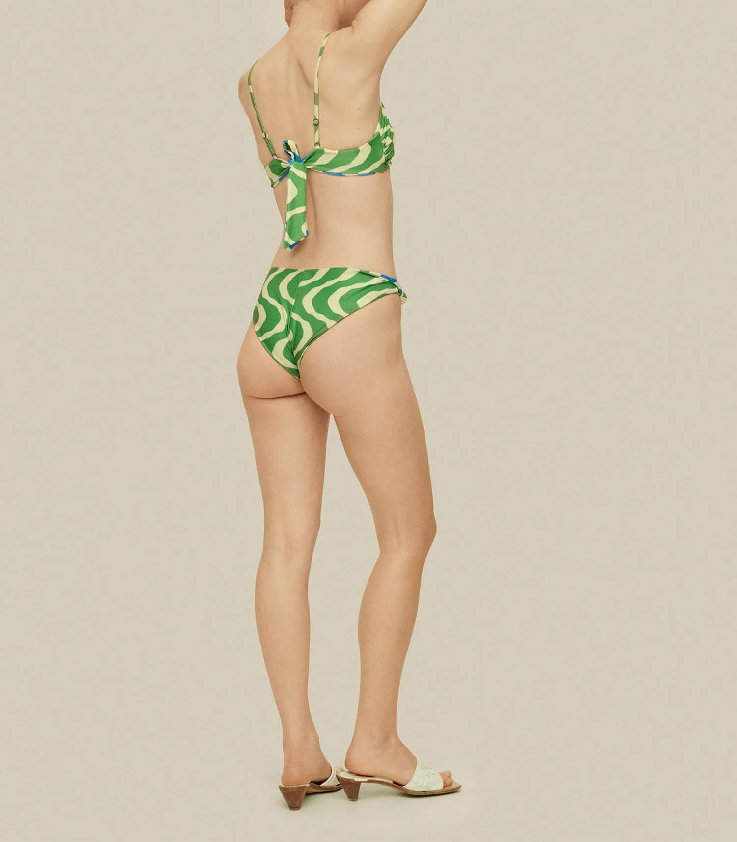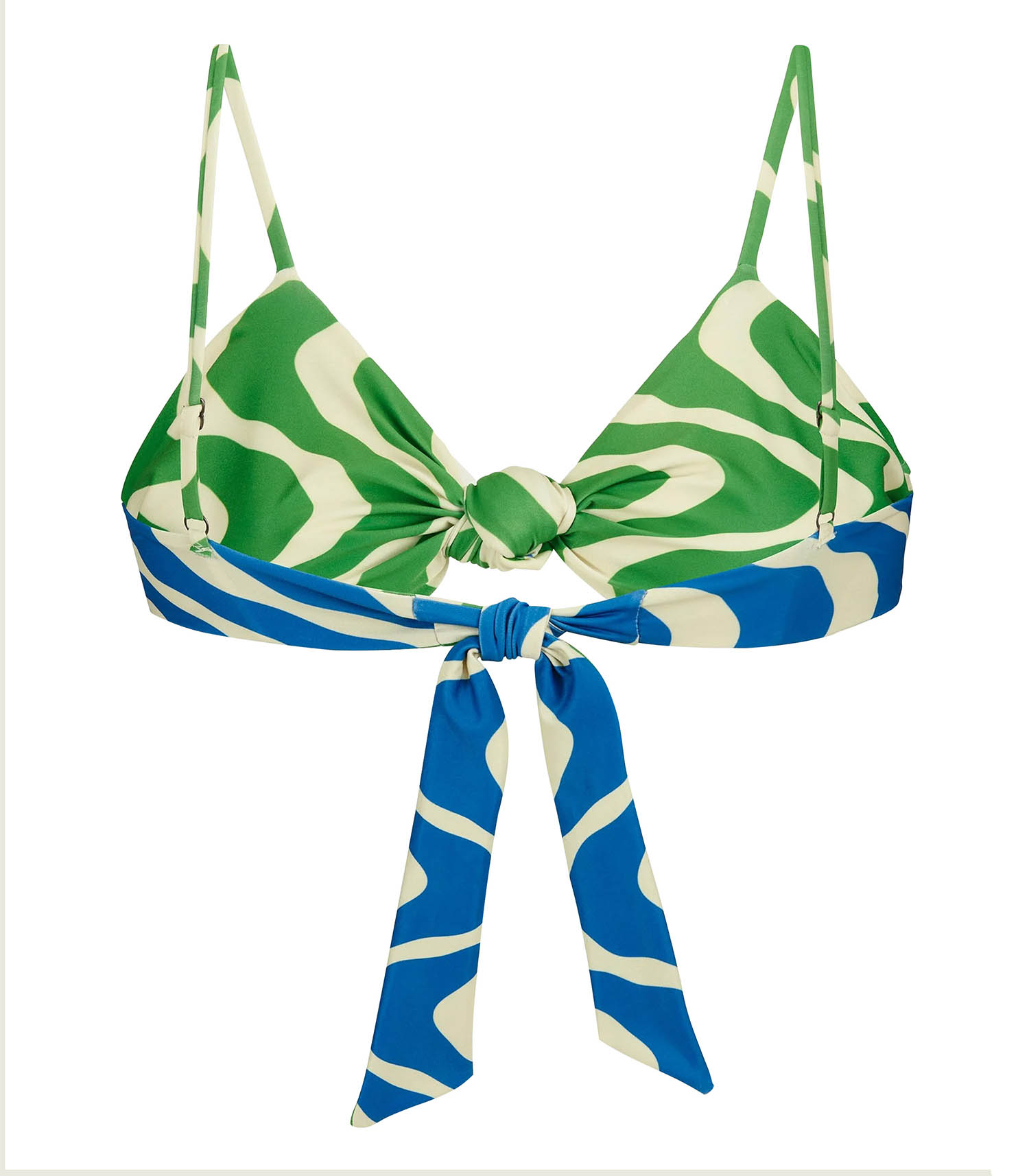 Haut de Maillot de bain Twin Rippling Onda pour femme signé OAS. Son design se distingue par une forme triangle conçue comme un foulard noué, avec un imprimé ludique à rayures courbées, façon seventies, dans des teintes vertes et beige. Le lien au dos contraste avec des rayures bleues.