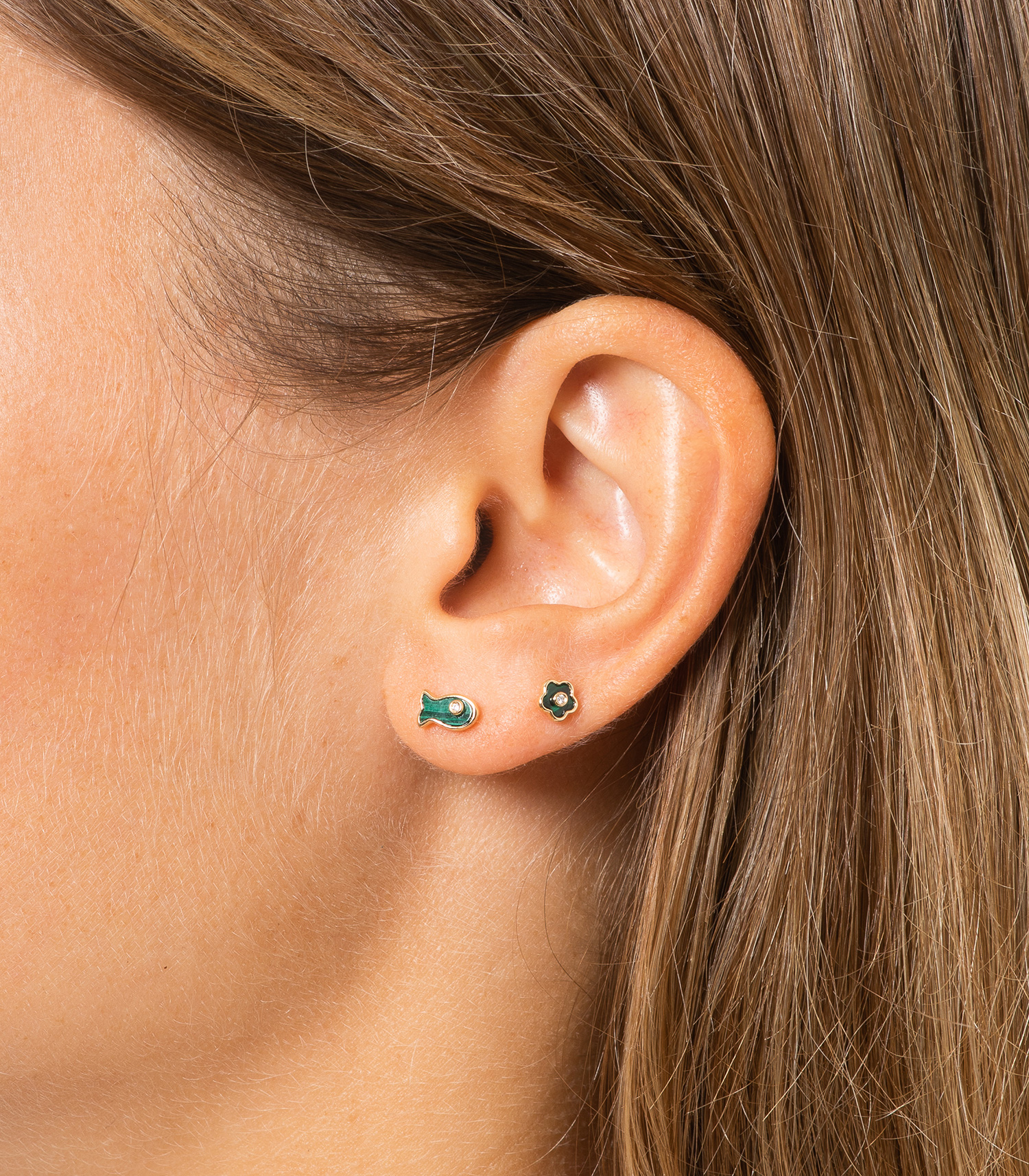 Boucle d'oreille Stud Flower Lapis de la marque Pamela Love, une petite puce miniature en forme de petite fleur arrondie, composée d'or 14 carats, de pierre Malachite verte et d'un petit diamant blanc au centre.