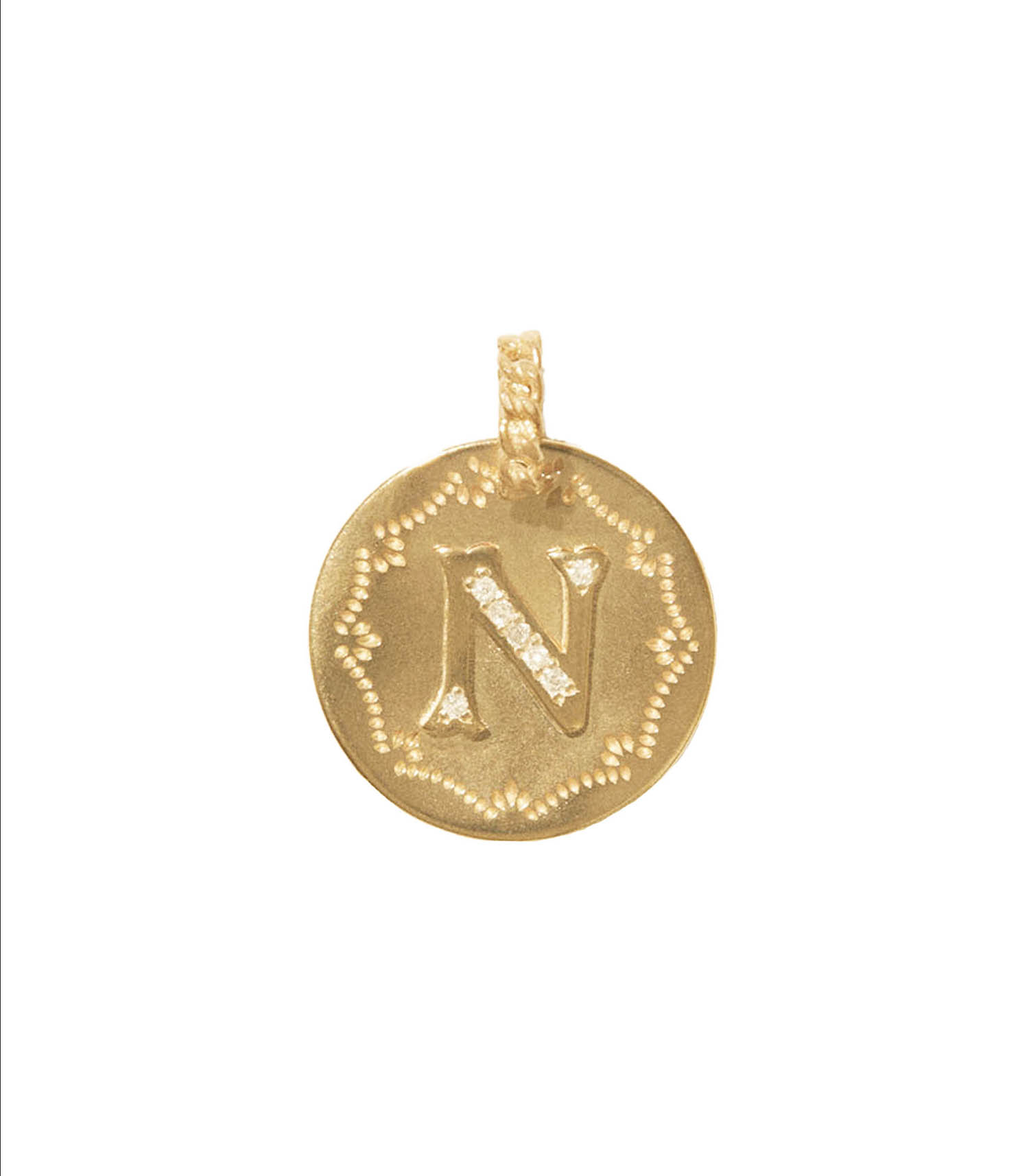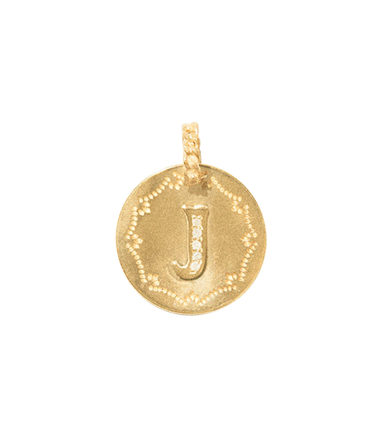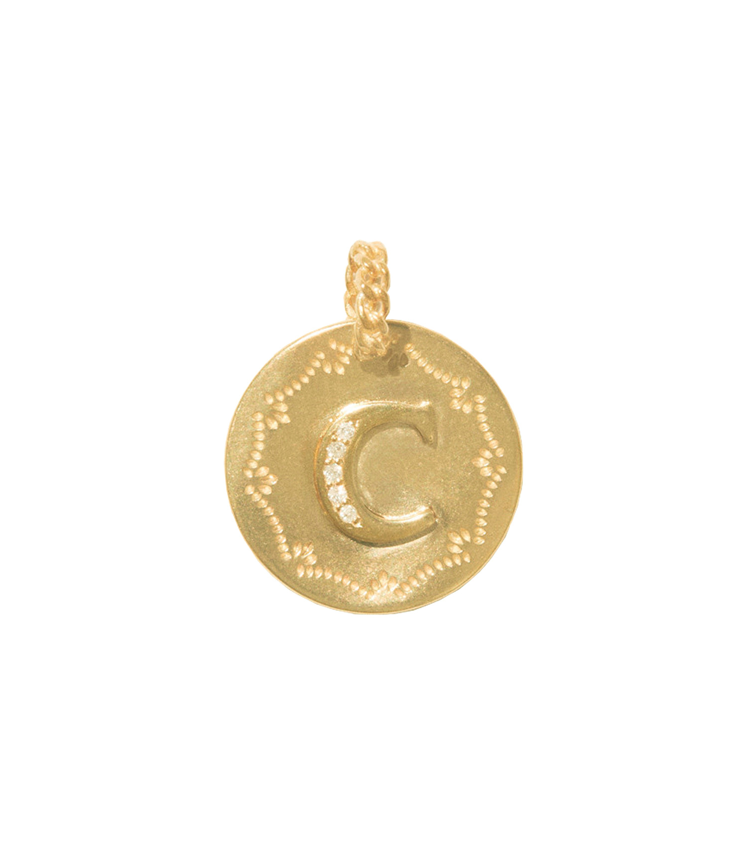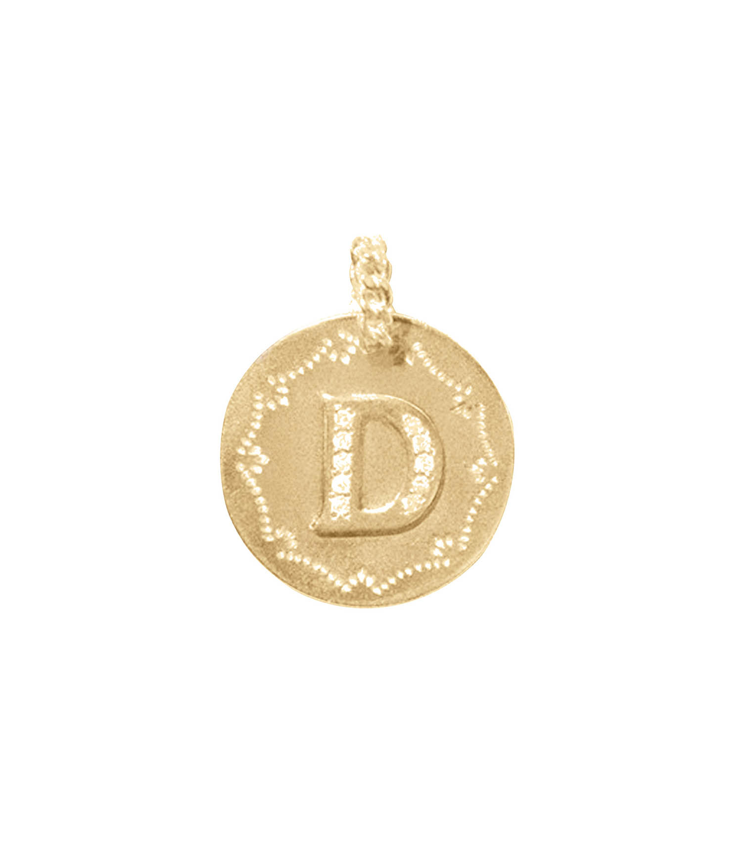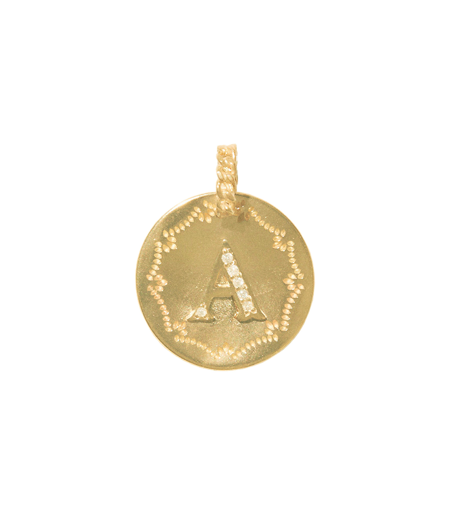 Personnalisez un collier ou une chaîne avec l'Amulette Alphabet signée Pascale Monvoisin en or jaune 9 carats. Chaque lettre est délicatement sertie de petits diamants afin d'apporter une touche de lumière à un bijou discret.