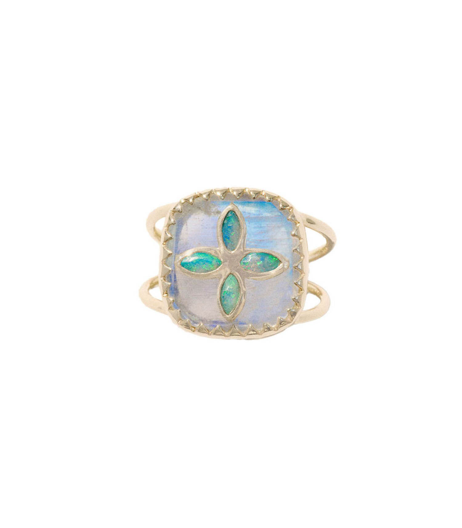 Bague Bowie n°2 Moonstone signée Pascale Monvoisin. L'un des thèmes phares de Pascale Monvoisin, Bowie aux inspirations rock et bohèmes, se décline sous un nouveau jour précieux et estival avec la combinaison de la pierre de lune et d'opale australienne. Combinée à de l'or jaune délicat et doux, c'est le bijou de l'été.