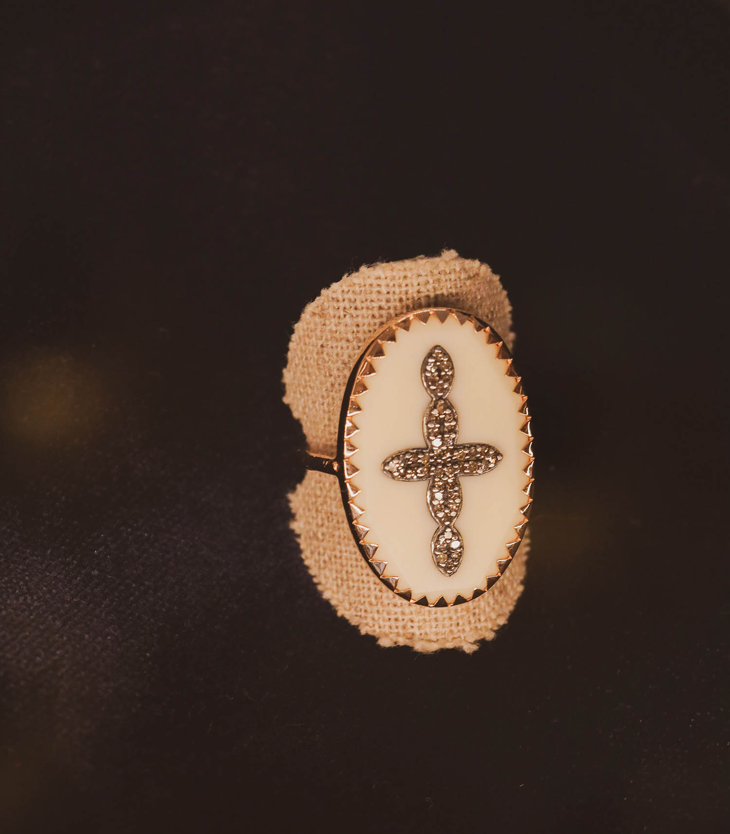 Bague Pascale Monvoisin, en or rose, bakélite blanche, serti or, diamants incrustés sur argent. Chaque pièce est unique, sa couleur et sa forme peuvent varier.