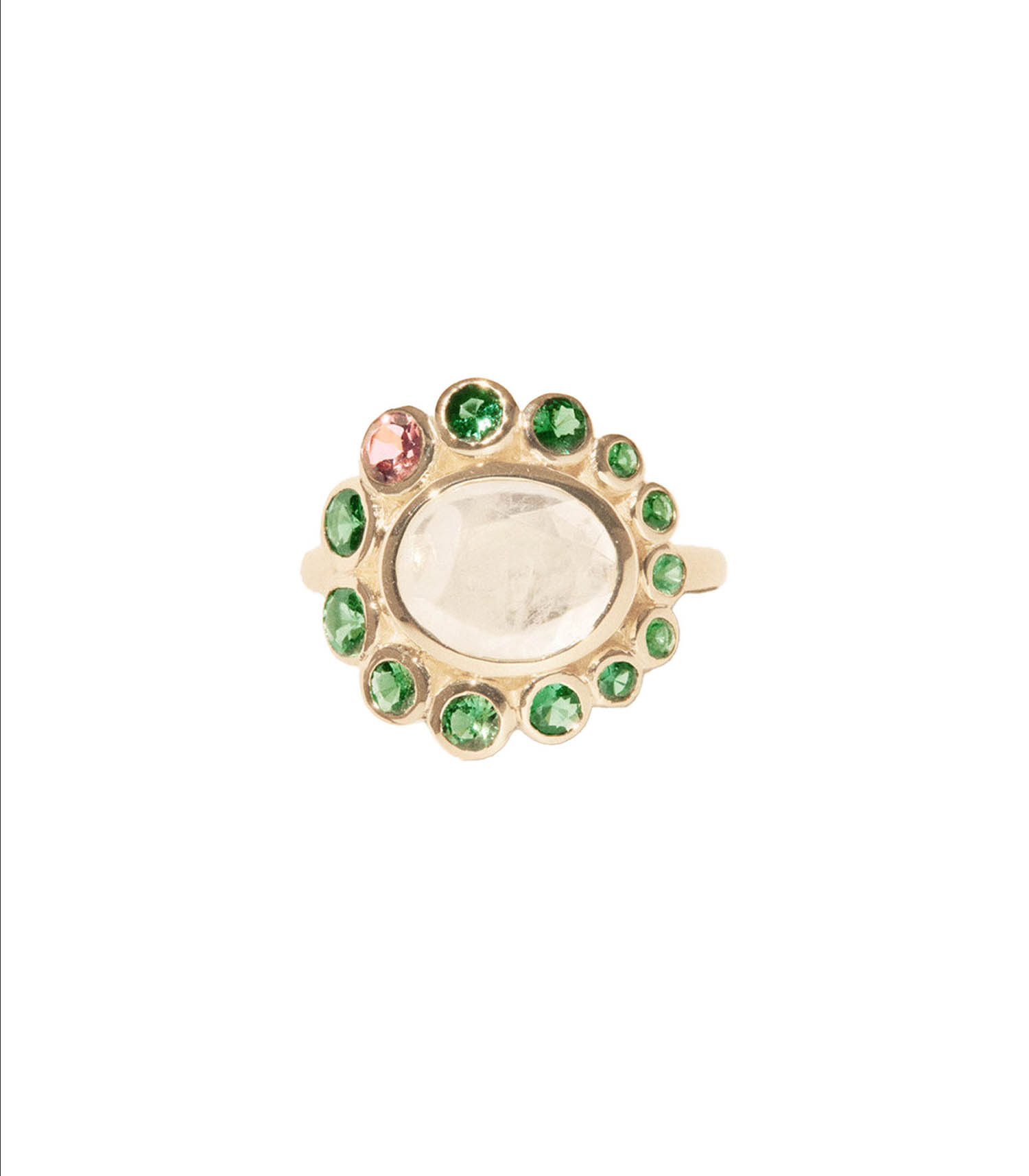 Bague Jasmine Tsavorite de la créatrice Pascale Monvoisin. Cette bague imposante aborde un motif marguerite composée d'une belle pierre de lune, et dont les pétales sont représentés par des tsavorites et des tourmalines.