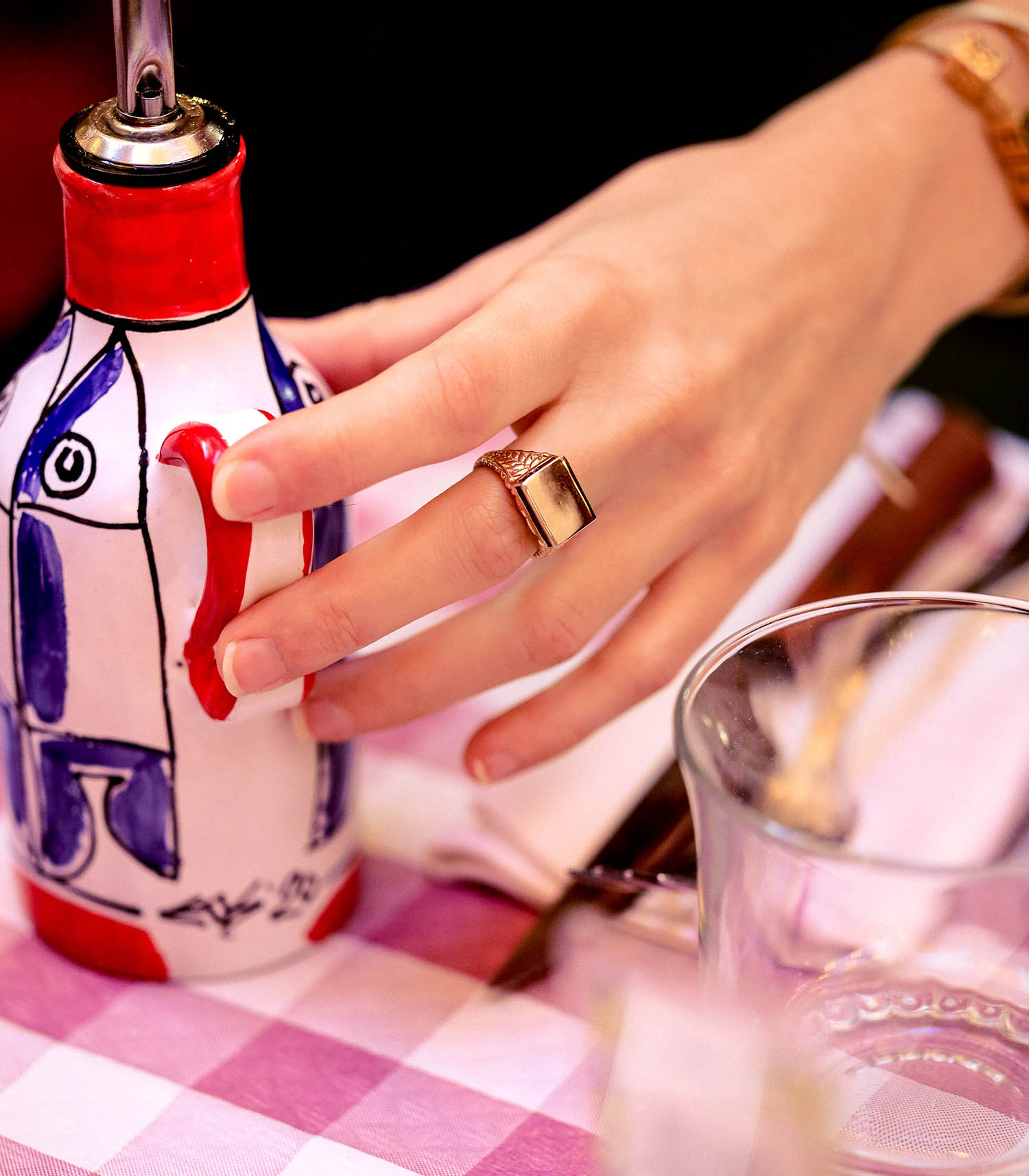 Bague Poppy London Blue signée Pascale Monvoisin, une chevalière unique qui se dinstingue par ses détails soignés et sa discrète topaze sertie.