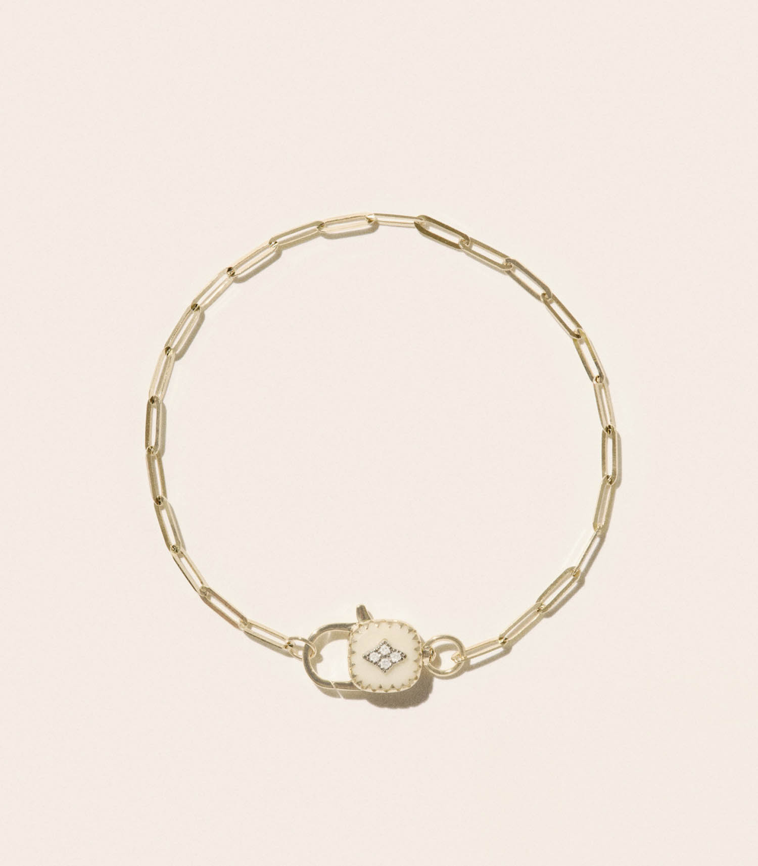 Bracelet Ginger Blanc signé Pascale Monvoisin. Cette collection revisite le dessin emblématique de la collection Pierrot, mêlant l’allure vintage du bijou à une chaîne plus contemporaine. Le fermoir, transformé en un cadenas minimaliste, devient un détail design et fonctionnel, symbole de liens à réinventer.