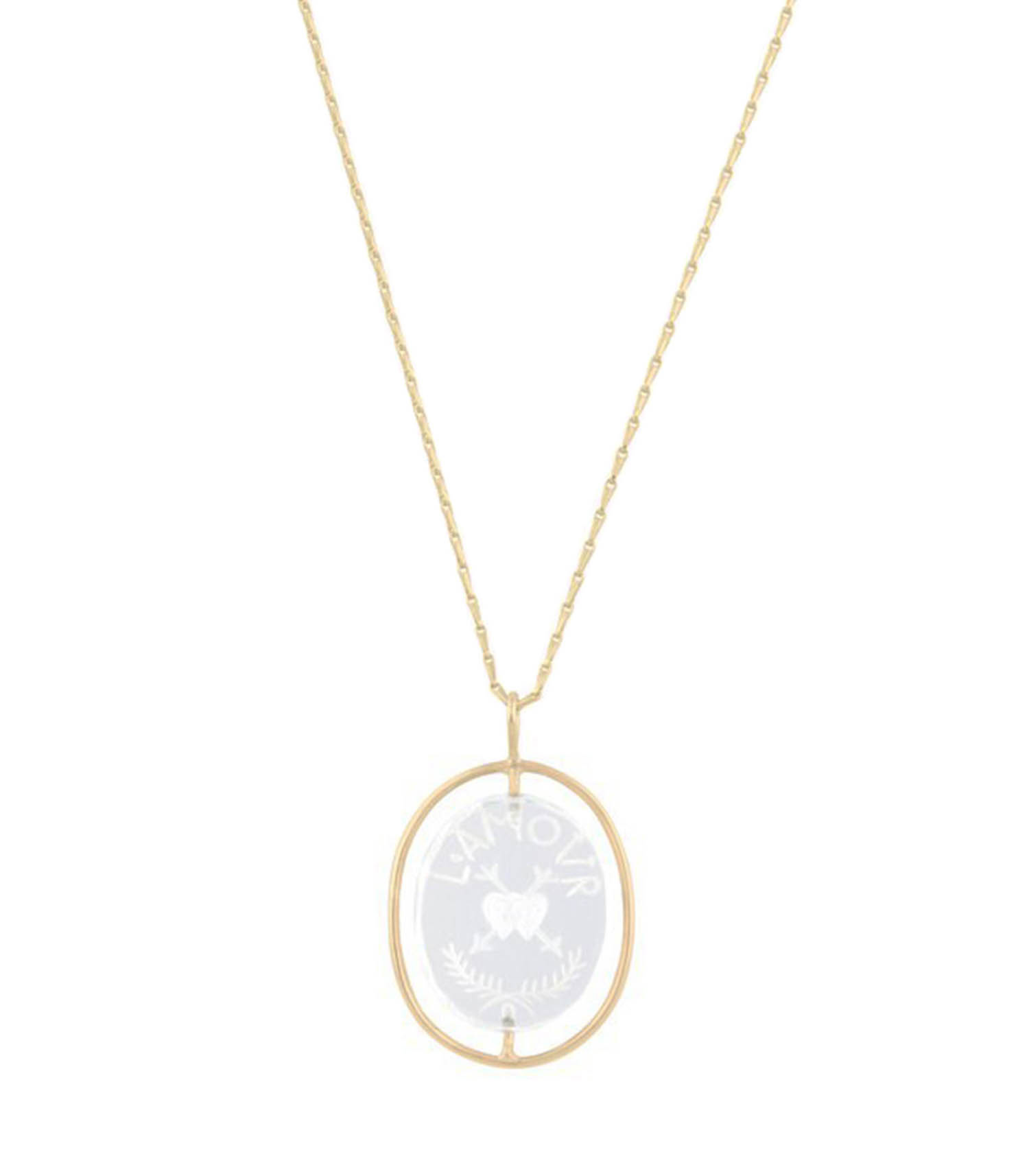 Le collier L’Amour n° 1 Cristal est un bijou raffiné et romantique, dessiné par Pascale Monvoisin. Ses inspirations bohèmes s’allient avec les matières raffinées, or jaune 9 carats et cristal. Le pendentif est gravé de l’inscription L’AMOUR et de deux cœurs percés d’une flèche et de feuillage.