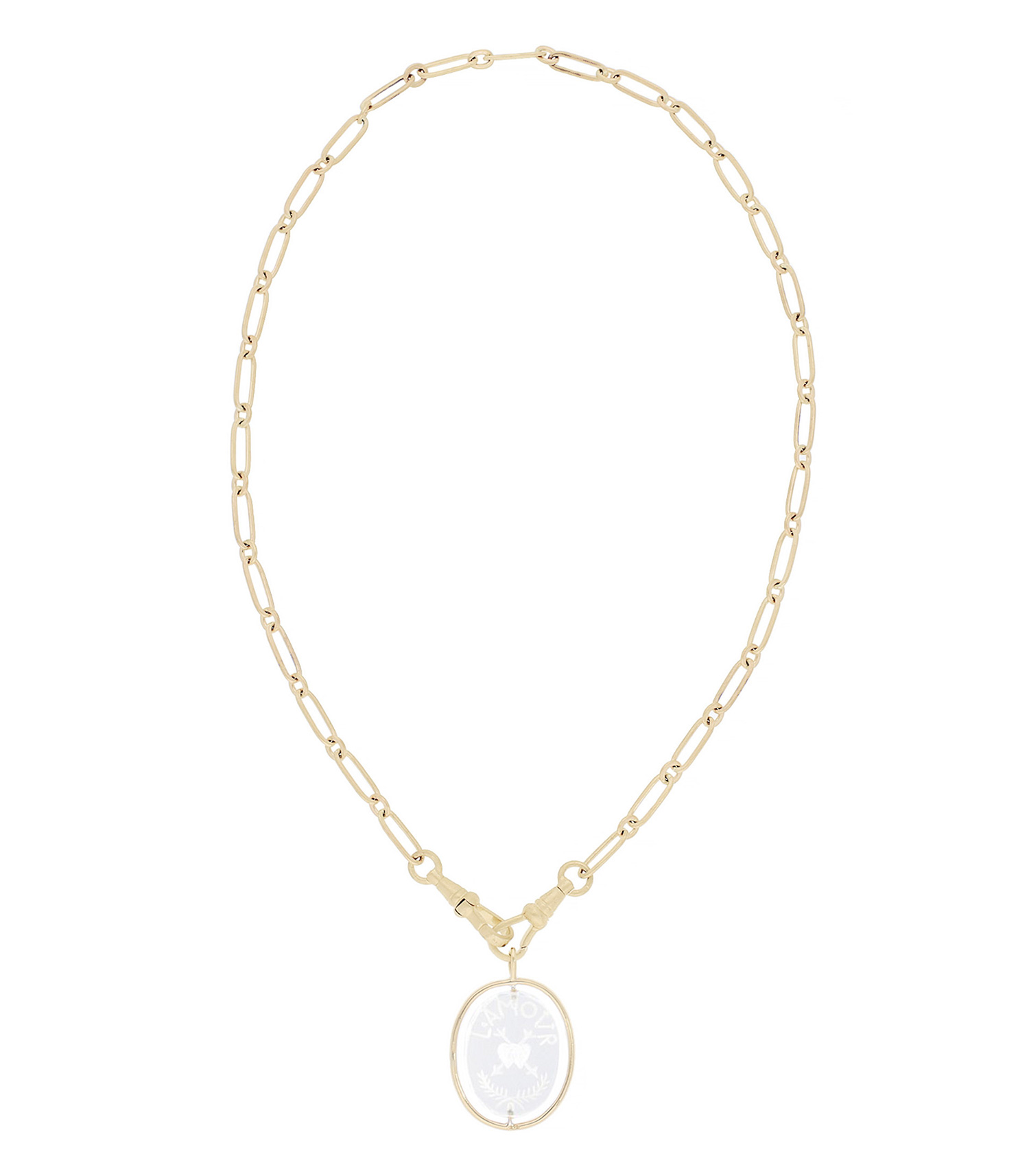 Pascale Monvoisin mixe inspirations vintage et détails contemporains pour créer des bijoux raffinés et faciles à porter, comme le collier L’amour Chrystal n° 2. Il est composé d’un pendentif en or et cristal, gravé de l’inscription L’AMOUR et de cœurs, monté sur une chaîne signature avec maillons rectangulaires et fermoirs mousquetons.
