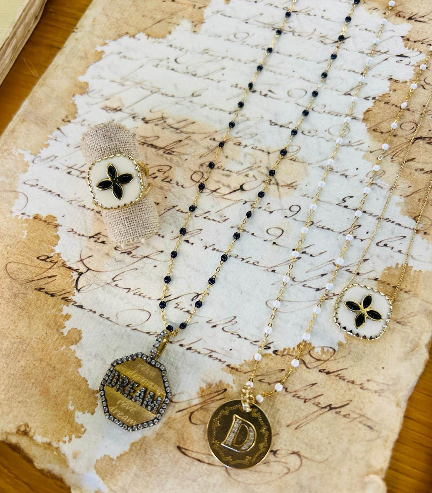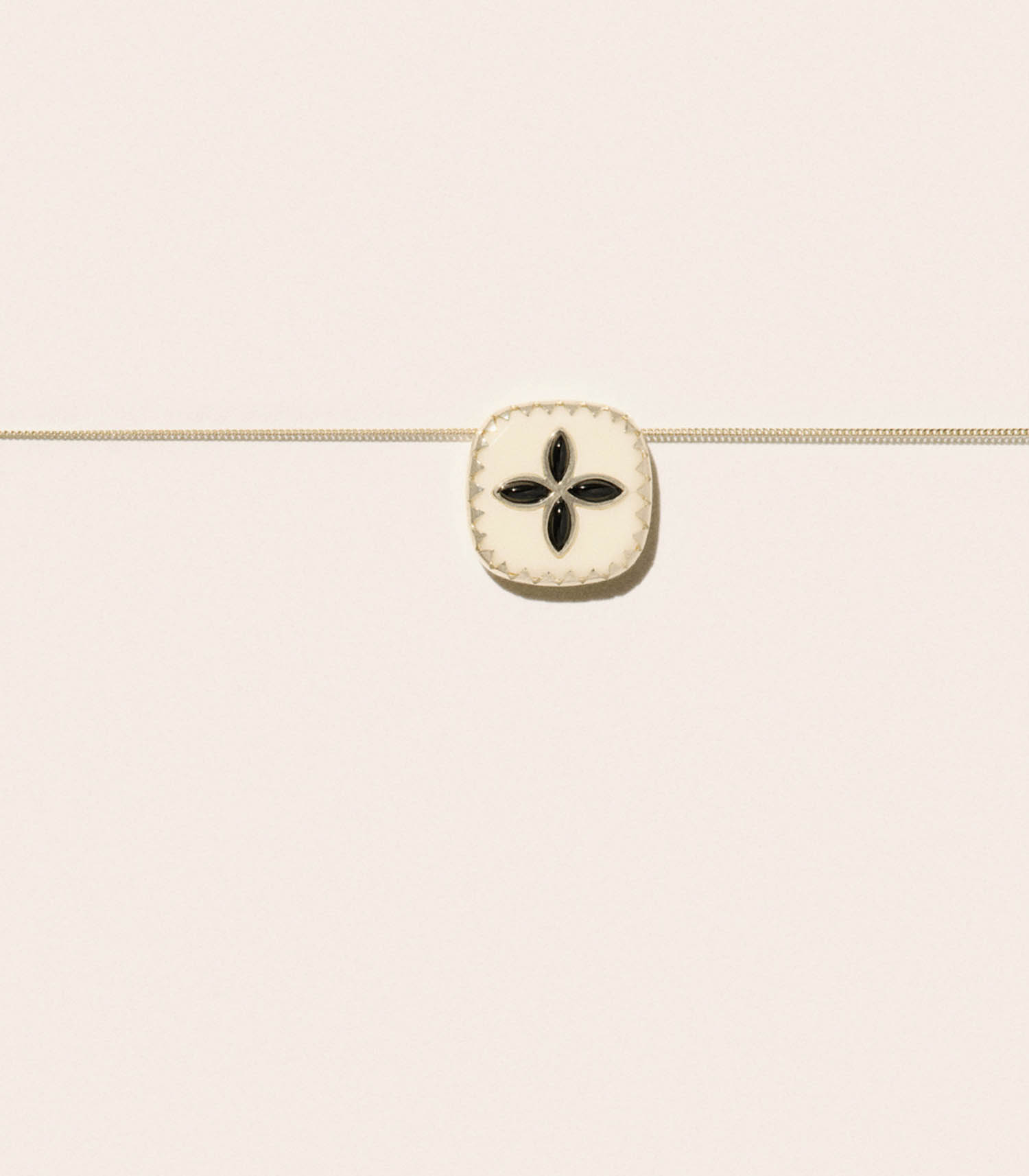Collier Bowie Blanc Onyx signé Pascale Monvoisin. La collection Bowie intemporelle des collections Monvoisin dessine des bijoux aux allures rock. Le pendentif avec sa base en résine blanche et ses pierres incrustées en Onyx noir révèle un contraste élégant.
