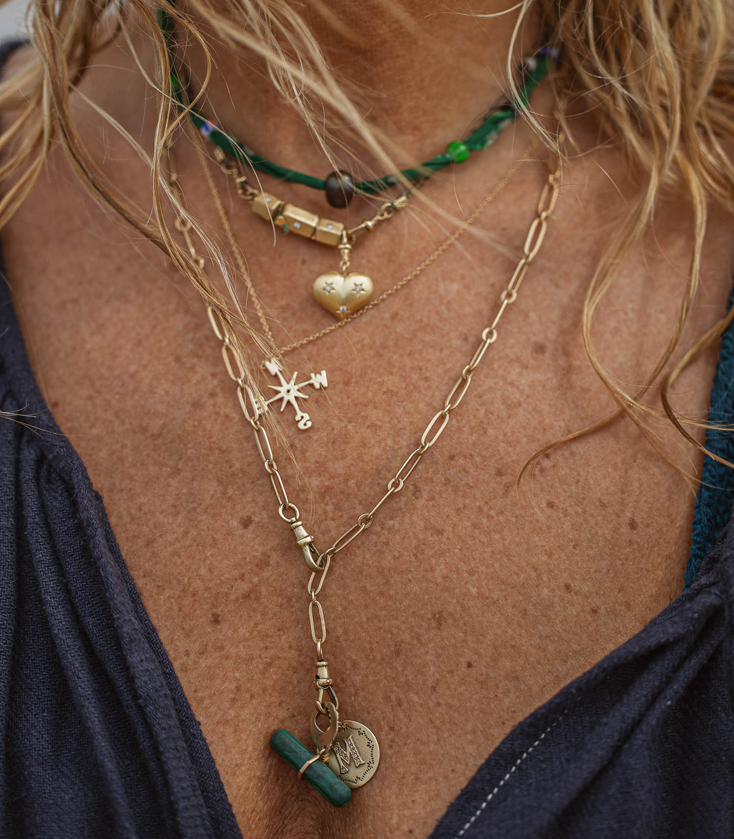 Collier Debbie N°3 Pascale Monvoisin en or jaune 9 carats, composé de maillons longs intercallés par de petits maillons ronds. L'or est mat et foncé avec un effet patiné, et le fermoir se compose de mousquetons qui peuvent également accueillir des amulettes.