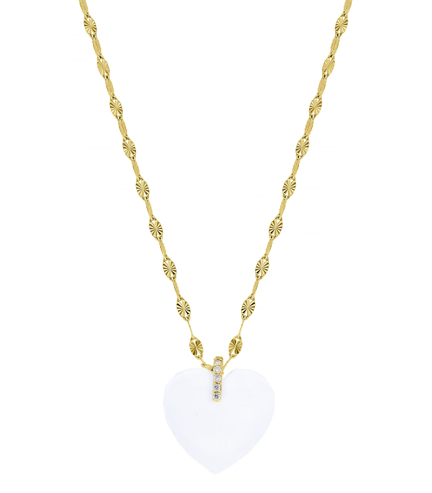 Modèle intemporel des collections Pascale Monvoisin, le collier Gabin se présente sous une nouvelle version montée sur une chaîne présentant des maillons plats et facettés, façon art déco. Le pendentif en cristal de roche aborde une forme de coeur gravé de rayons, et un maillon serti de petits diamants blancs qui le raccorde à la chaîne. Conçu pour capter la lumière, il rayonnera à votre cou.