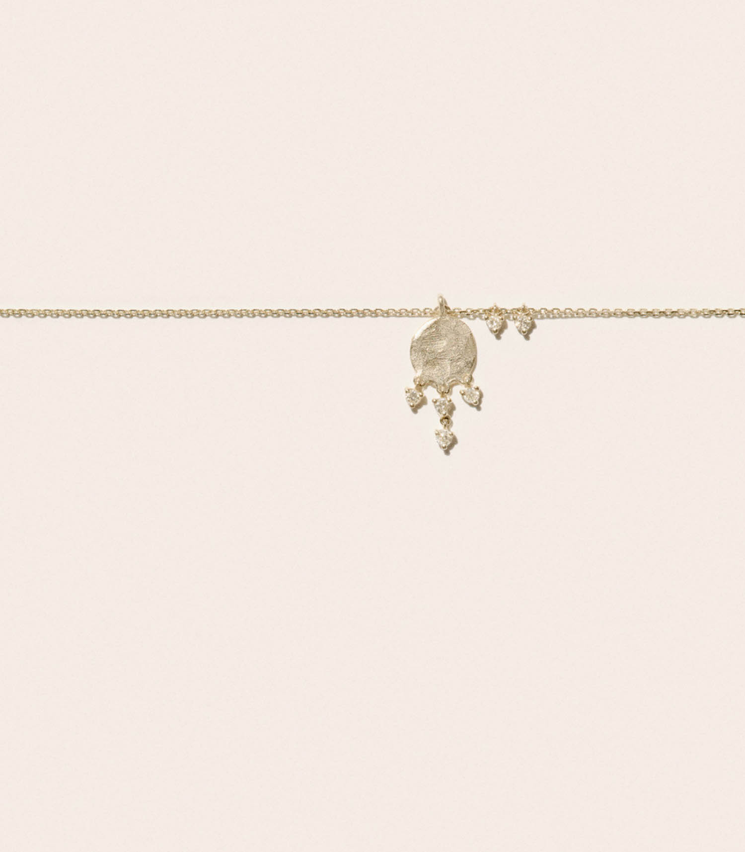 Collier Gaby n°1 signé Pascale Monvoisin. Cette collection sublime l’or texturé, évoquant l’apparence délicate de la feuille d’or. L’or capte la lumière à chaque mouvement, tandis que les cascades de diamants s’entrelacent et se répondent, créant un jeu d’éclat et de fluidité.??