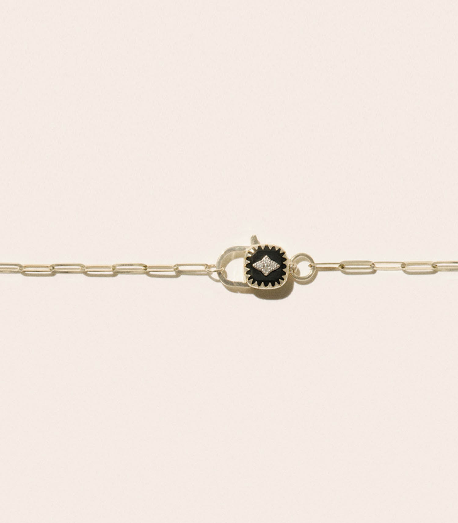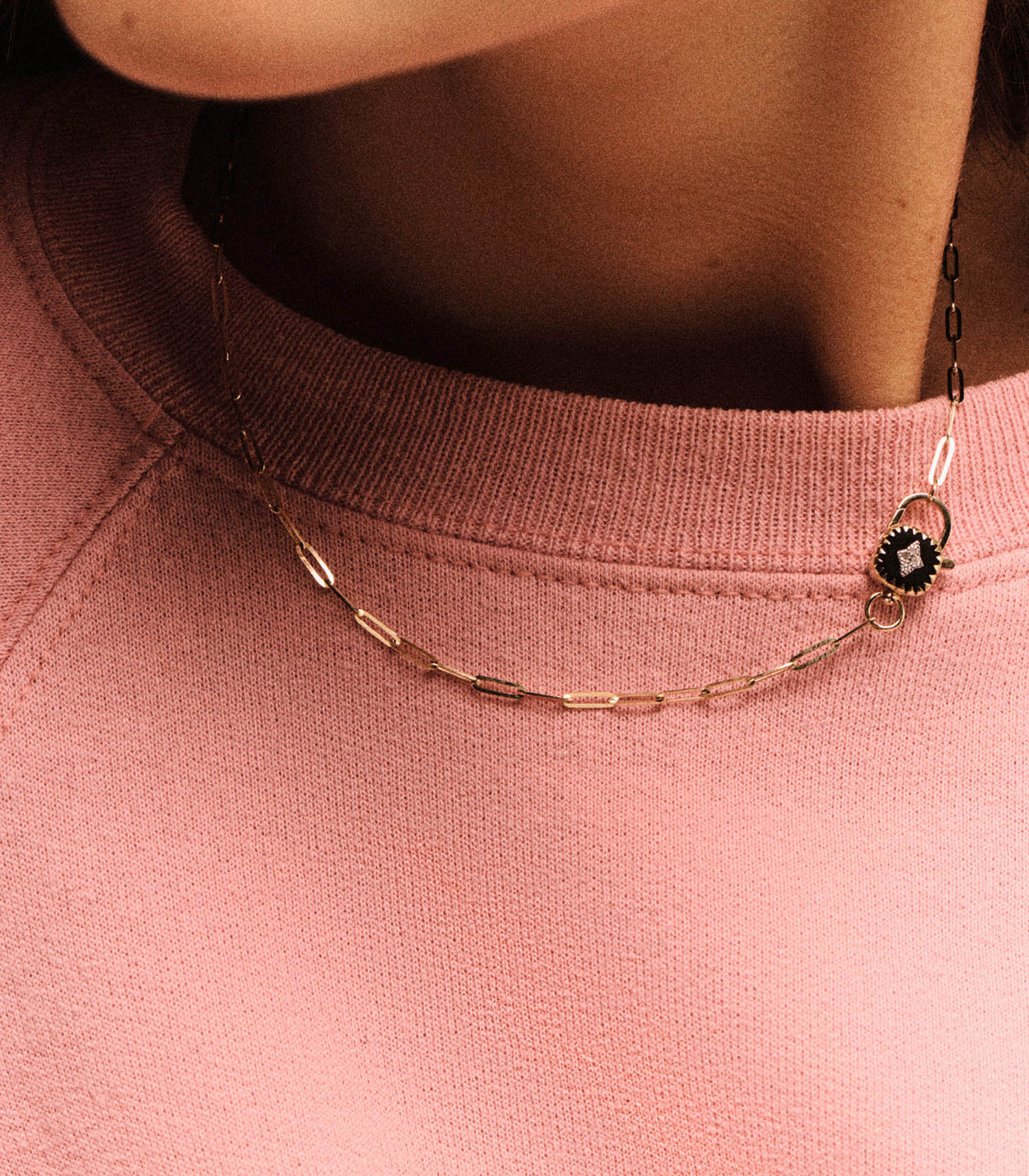 Collier Ginger Noir signé Pascale Monvoisin. Cette collection revisite le dessin emblématique de la collection Pierrot, mêlant l’allure vintage du bijou à une chaîne plus contemporaine. Le fermoir, transformé en un cadenas minimaliste, devient un détail design et fonctionnel, symbole de liens à réinventer.