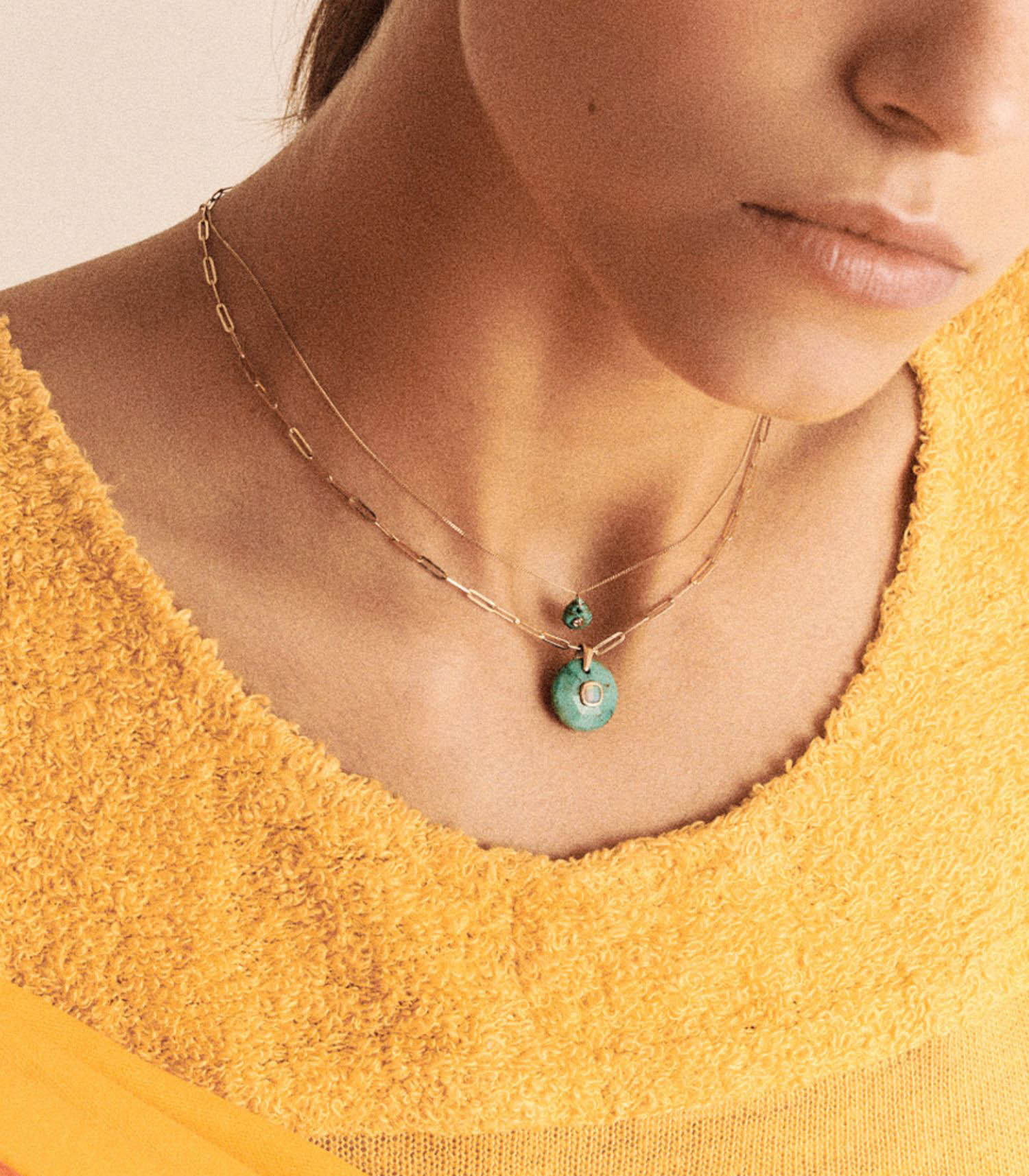 Collier Milo Moonstone signé Pascale Monvoisin. Ce nouveau collier prolonge l’esprit des pierres incrustées Orso, mêlant formes rondes et éclats minéraux. Pierre de lune, turquoise et opale s’y répondent en une palette vibrante, suspendue sur une chaîne en or fin, juste au ras du cou. Un bijou solaire, à la fois délicat et lumineux.