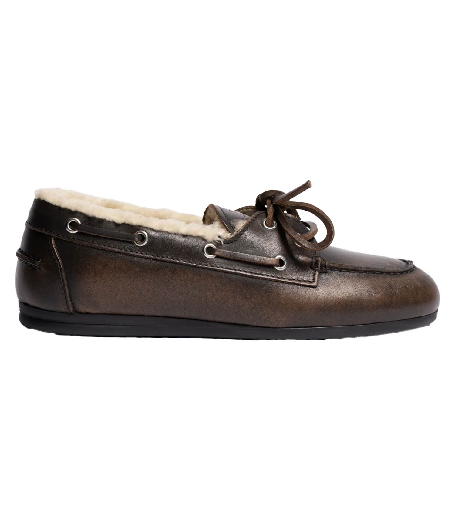 Mocassins Boat Brushed Fur Coffee signés Posa. Le charme vintage rencontre le confort naturel de ces mocassins style bateau en cuir raffiné à la finition vintage et à la doublure intérieur en fourrure écru pour une touche luxueuse. Cette dernière assure un ajustement parfait, les rendant aussi confortables qu'élégants.
