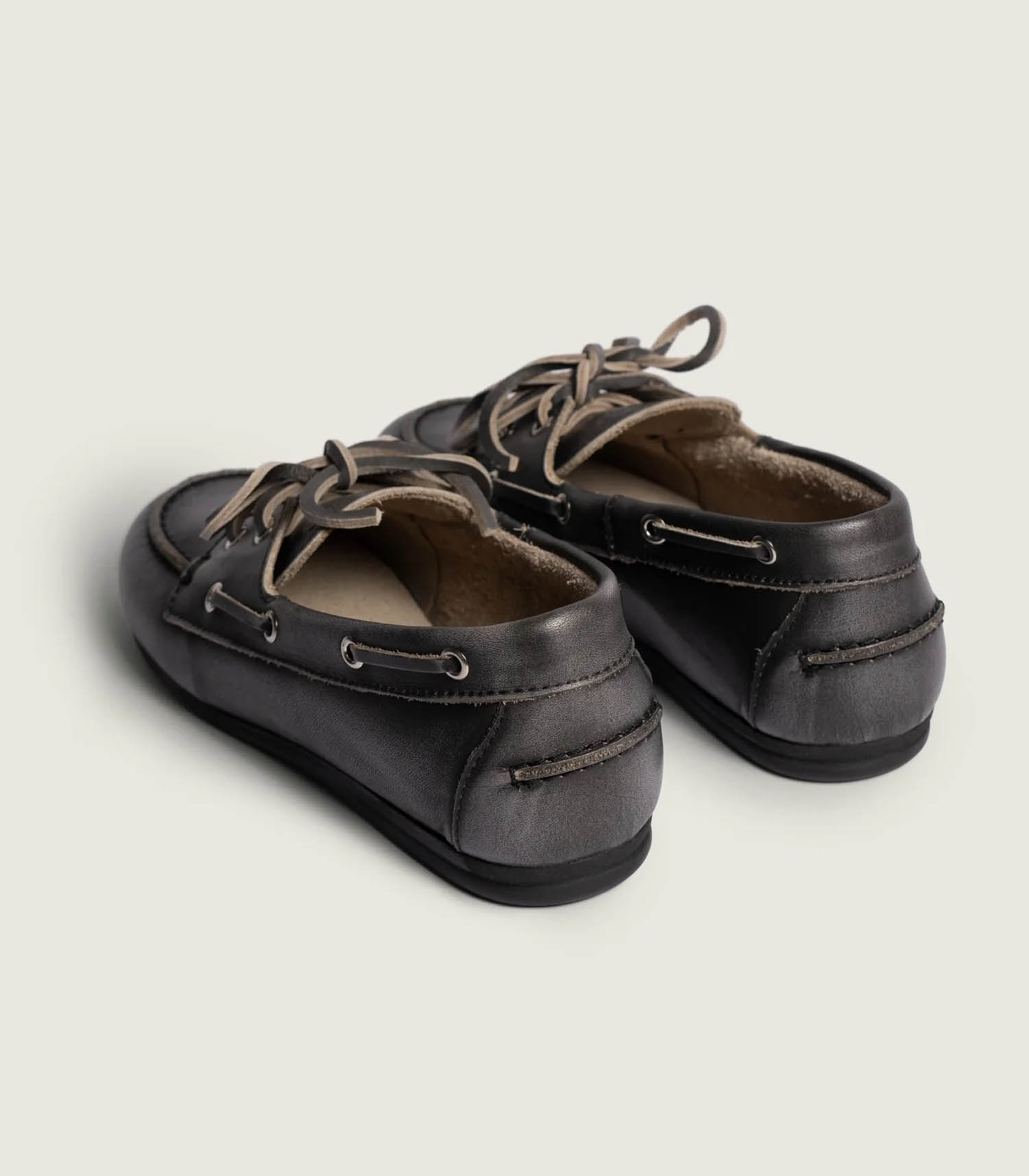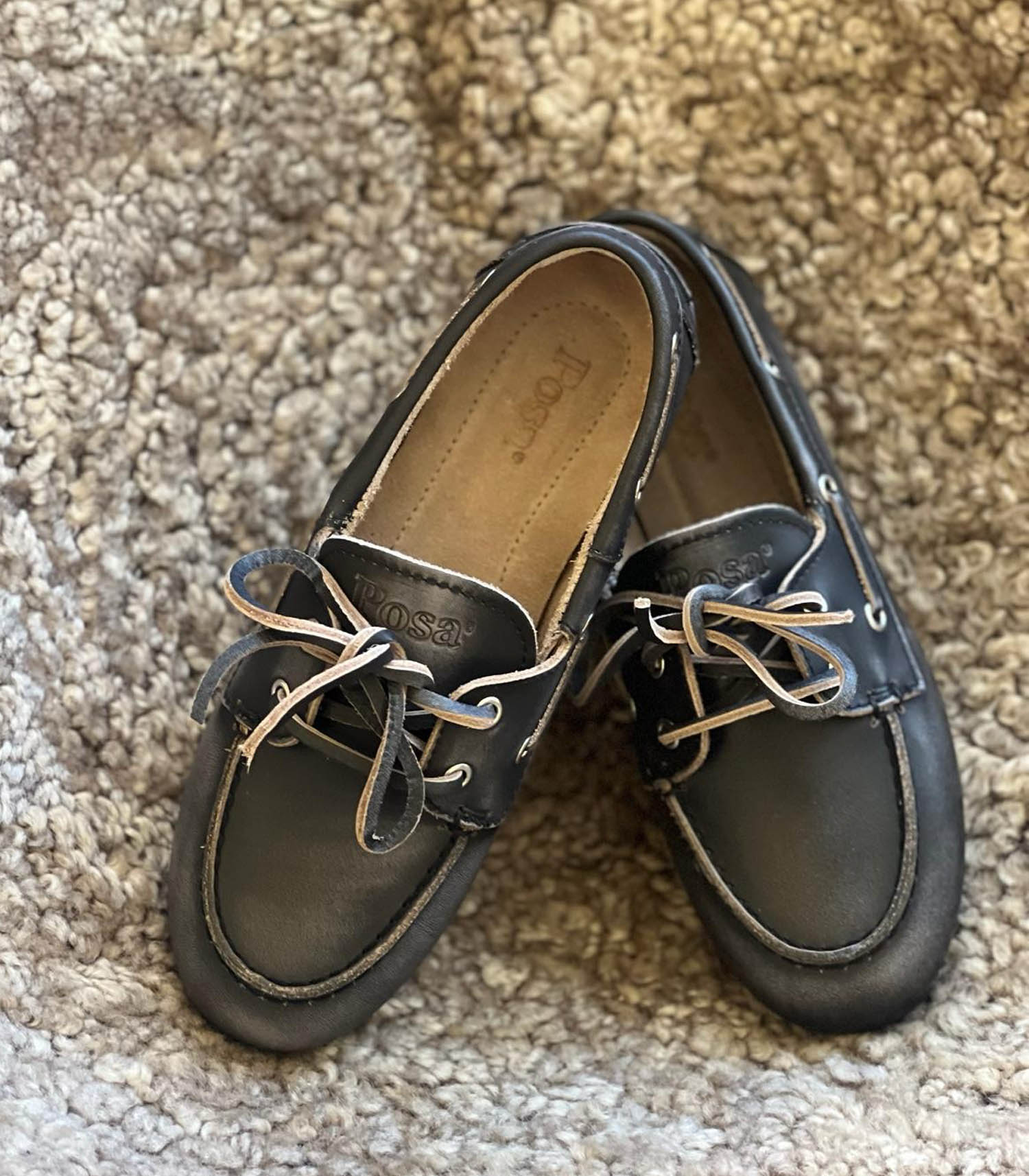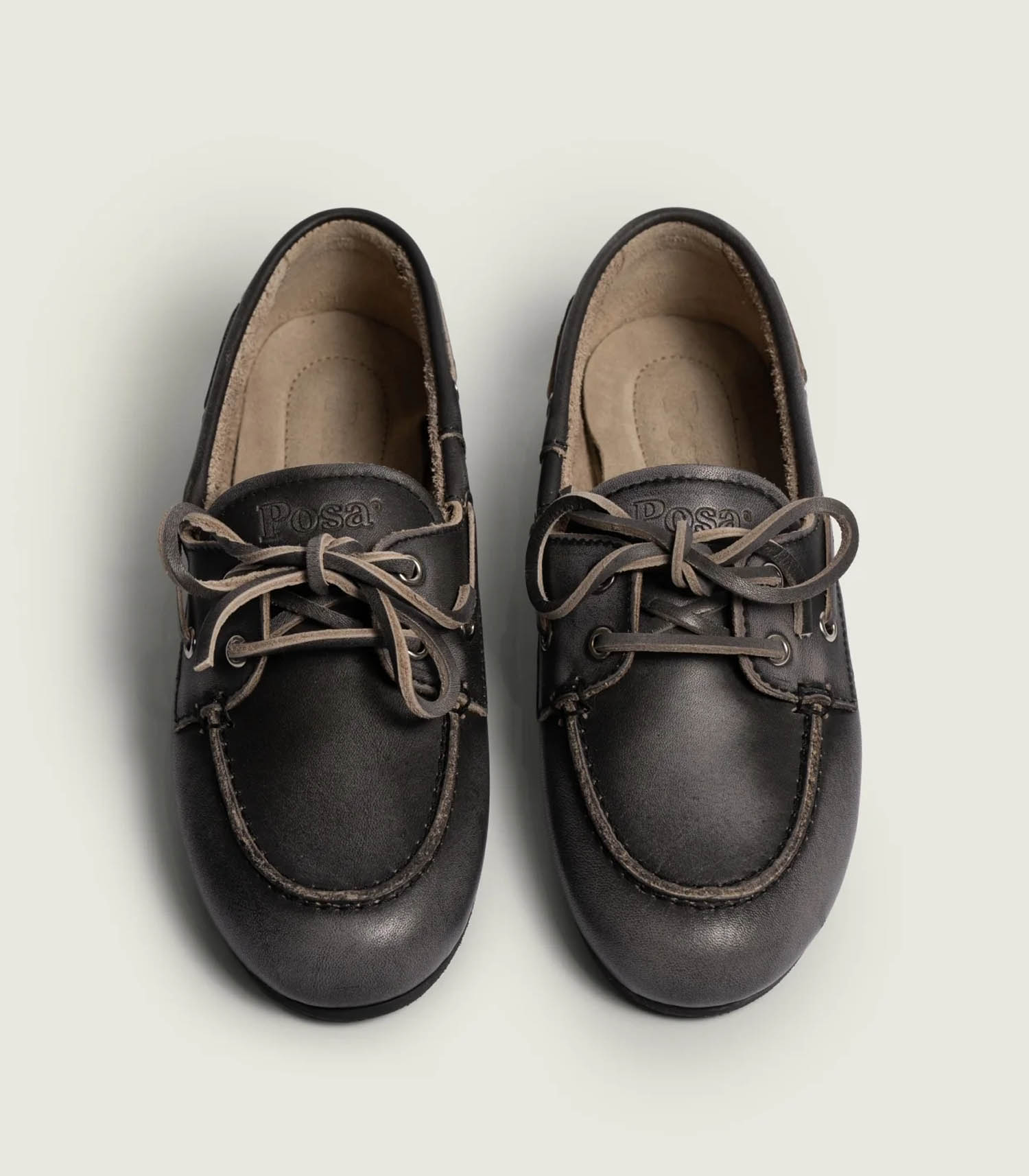 Mocassins Boat en Cuir Brushed Black signés Posa. Le charme vintage rencontre un confort absolu dans ces mocassins bateau en cuir raffiné à la finition vieillie. La semelle intérieure ultra-douce et rembourrée assure un chaussant parfait, pour un confort aussi impeccable qu'élégant.