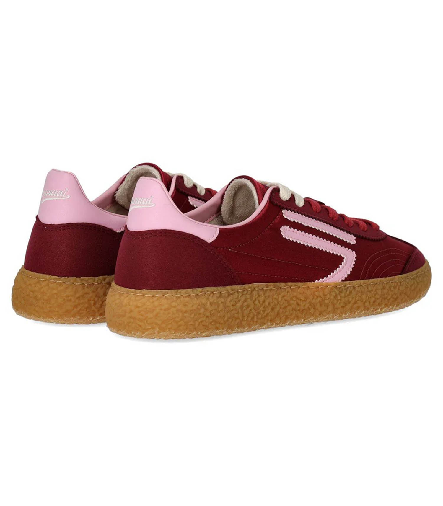 Sneakers 6.01 XS Cherry Juice signées Puraai, confectionnée en tissu à effet satiné, avec des empiècements en cuir vegan dans des tons magenta et rose. Elle présente des lacets en coton assortis ou contrastants, une languette avec logo et un intérieur en tissu éponge de coton. Talon rose avec logo blanc brodé. Elle se caractérise par une tige avec logo dans des tons roses.