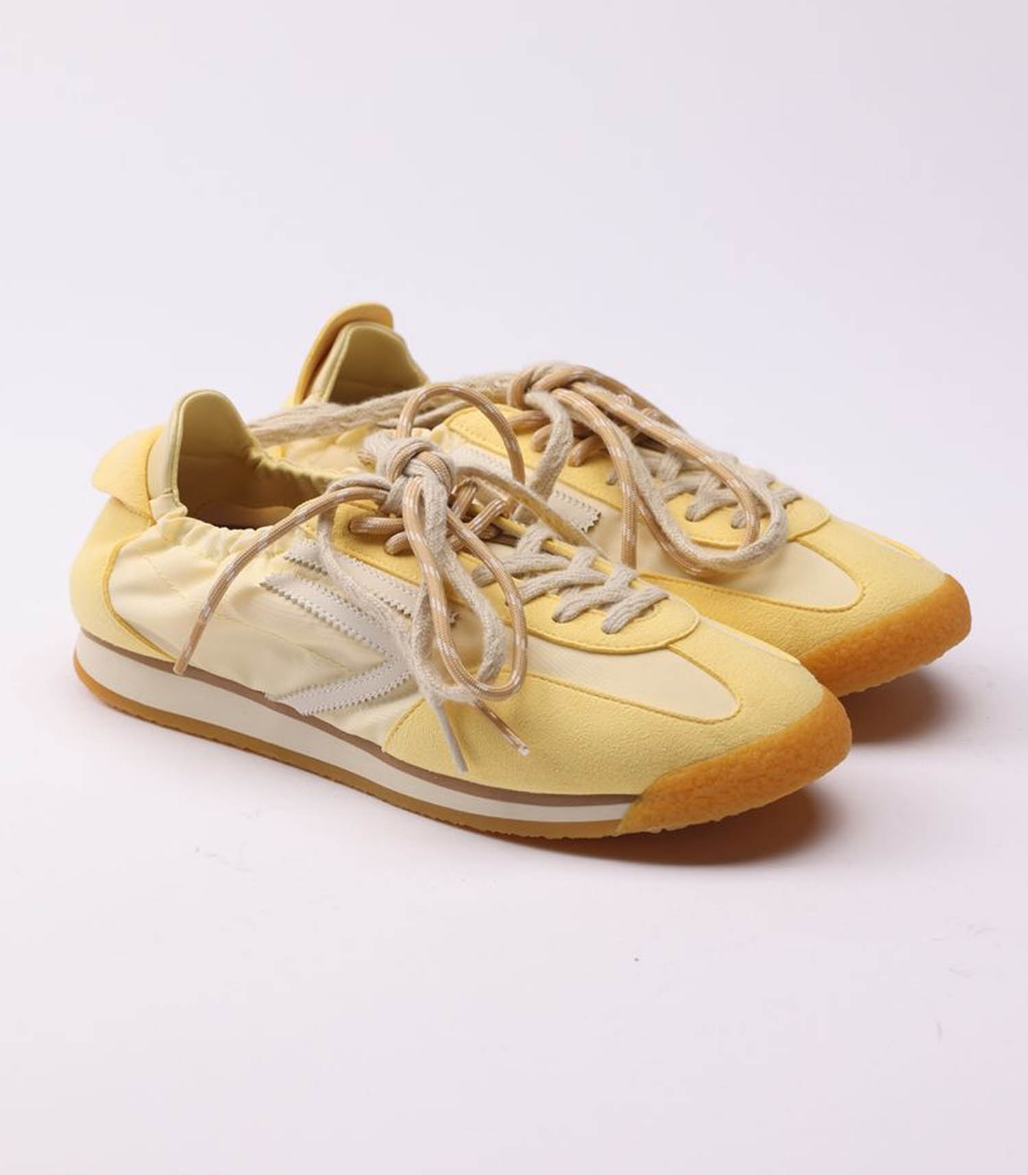Le design est inspiré des années 80 avec une tige fine et souple dans une teinte beurre et empiècements en suède jaune pâle, resserrée au niveau de la cheville. Lacets crème et blanc dans un esprit sportif.
