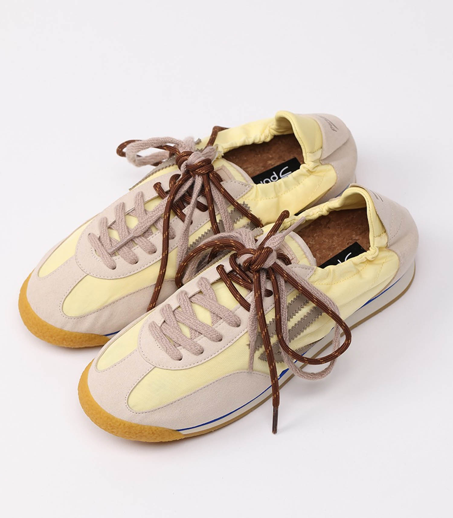 Le design est inspiré des années 80 avec une tige fine et souple jaune pâle et empiècements en suède gris clair, resserrée au niveau de la cheville. Lacets marron et beige dans un esprit sportif.
