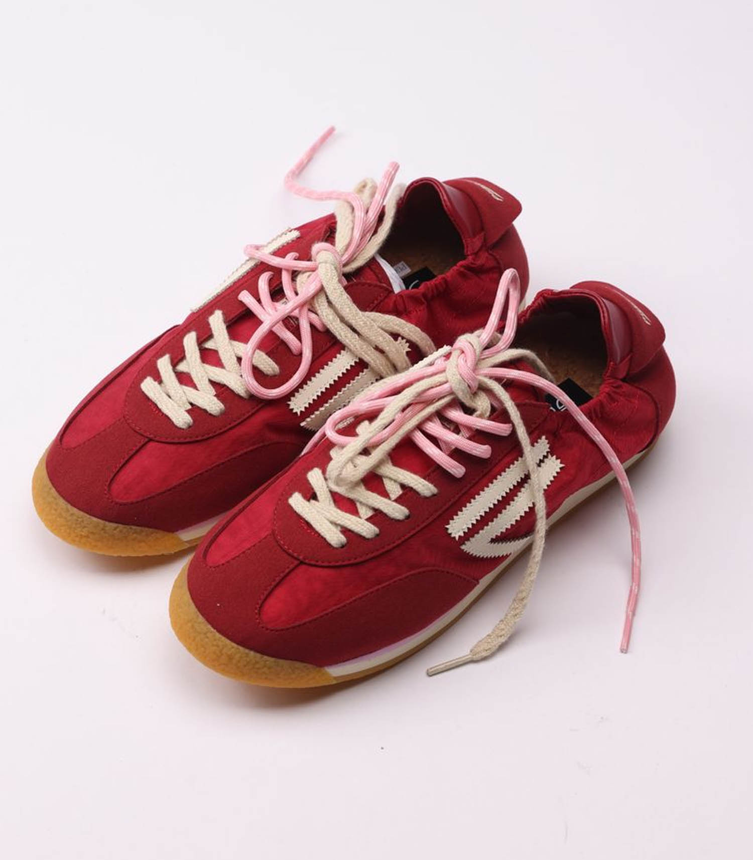 Le design est inspiré des années 80 avec une tige fine et souple rouge foncé et empiècements en suède, resserrée au niveau de la cheville. Lacets rose clair et ecru dans un esprit sportif.