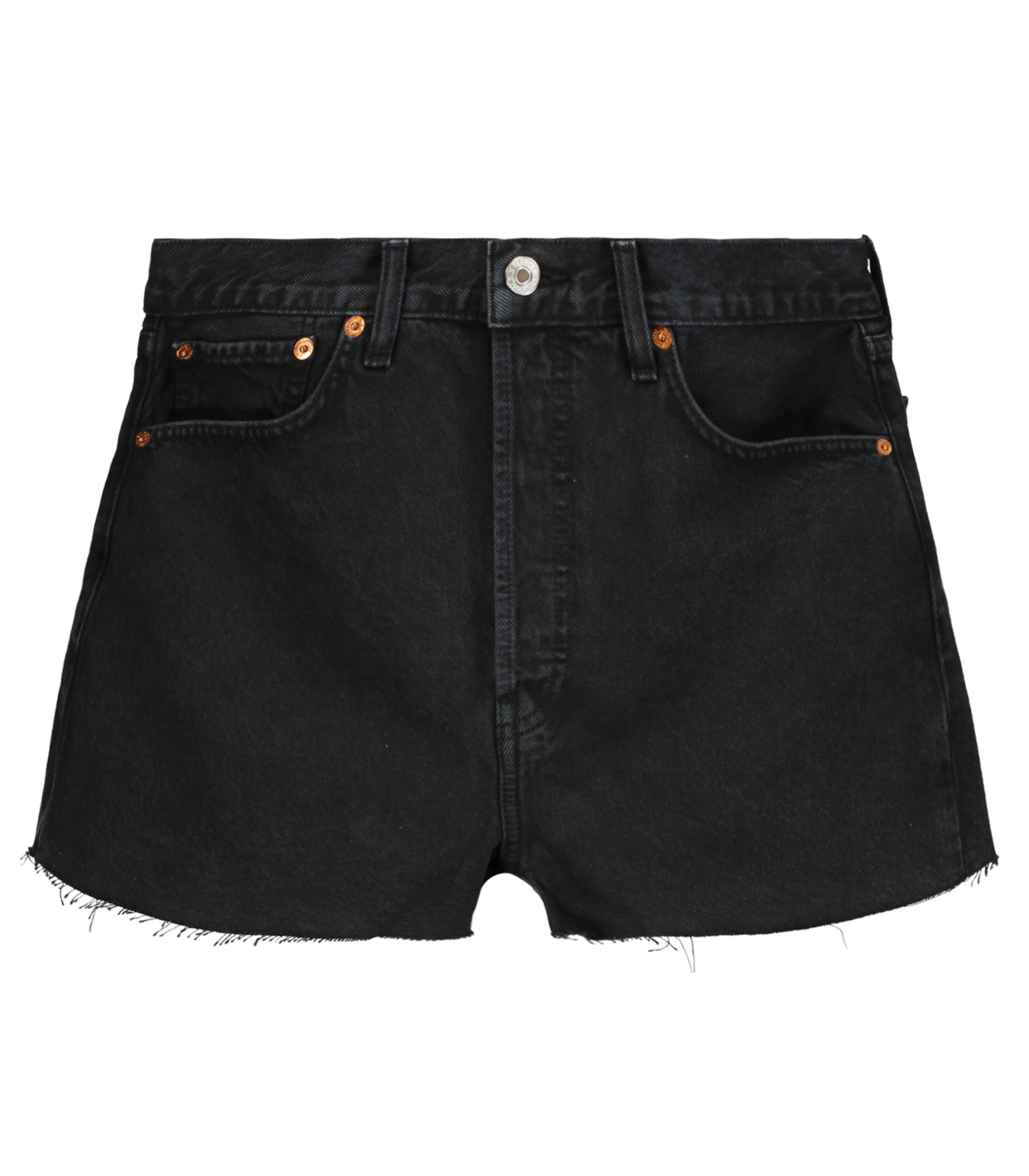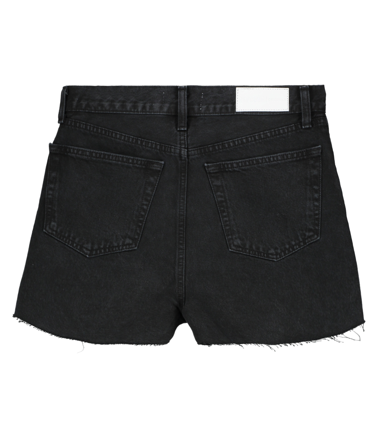 Short Re/Done à taille haute, modèle “High Rise Short” en denim noir surteint. Une coupe flatteuse qui allonge naturellement la silhouette. Bords francs aux cuisses. Traditionnelles cinq poches. Fermeture et braguette à boutons argentés. Rivets rouge cuivrés contrastants.