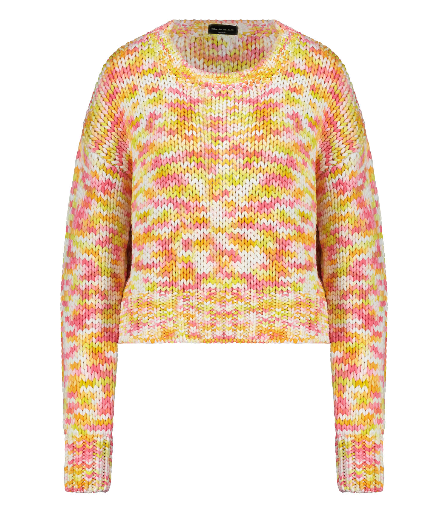 Pull Col Rond Arancio de la marque Roberto Collina. Ce pull oversize en fil rond imprimé, offre un effet défini multicolore à couper le souffle. Ses bords côtelés au col, aux poignets et au bas structurent la silhouette tout en mettant en valeur son allure décontractée et moderne.