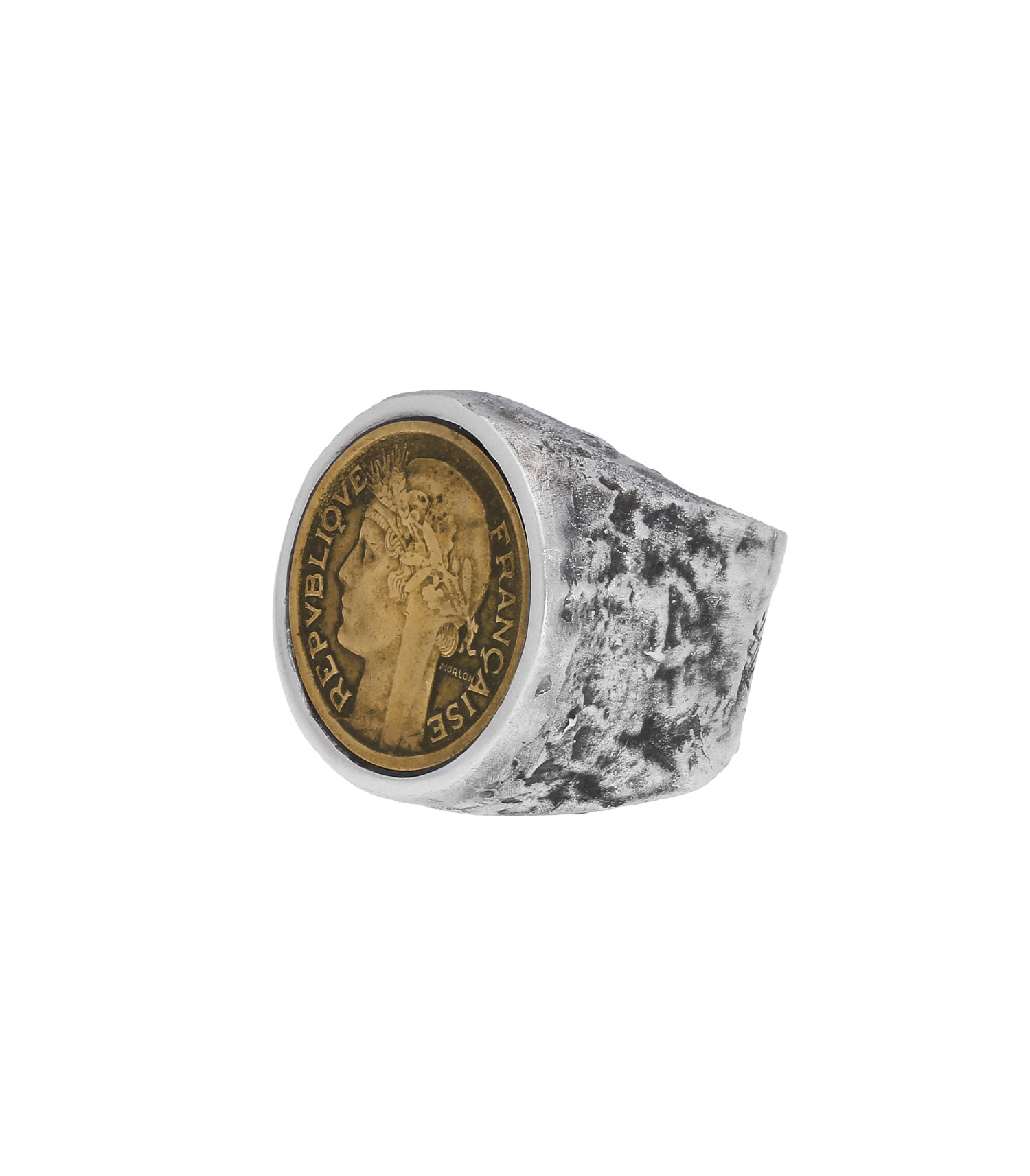 Bague pièce "République Française" Roc Paris. Cette bague est composée d'un anneau en argent 925 fabriqué à la main sur lequel on retrouve une pièce authentique de 50 centimes Morlon de l'ancien système de monnaie français.