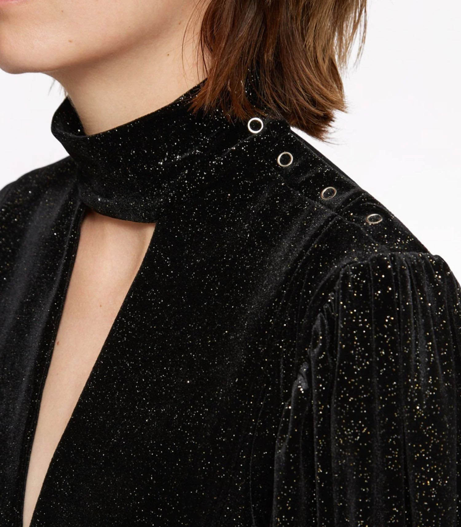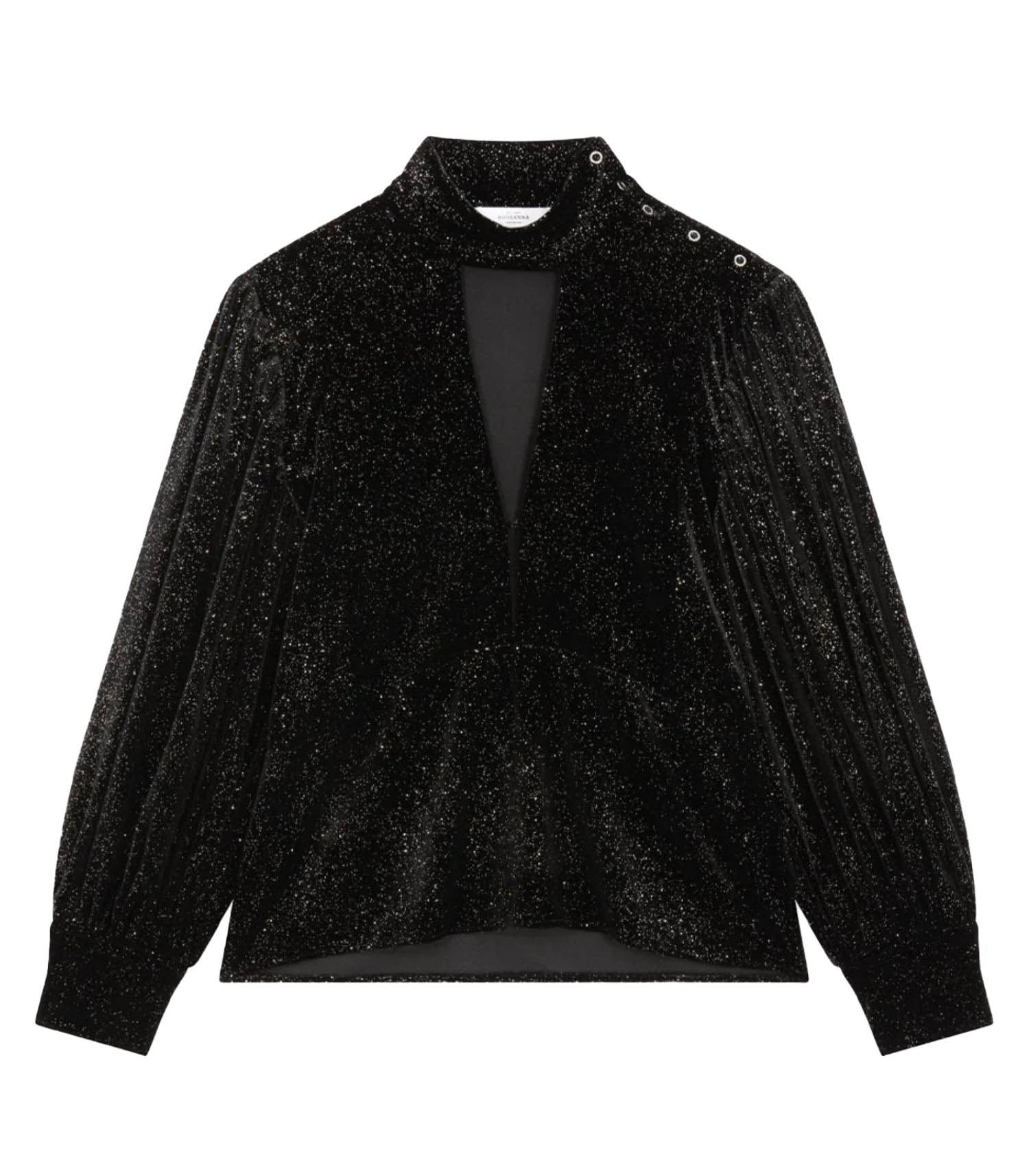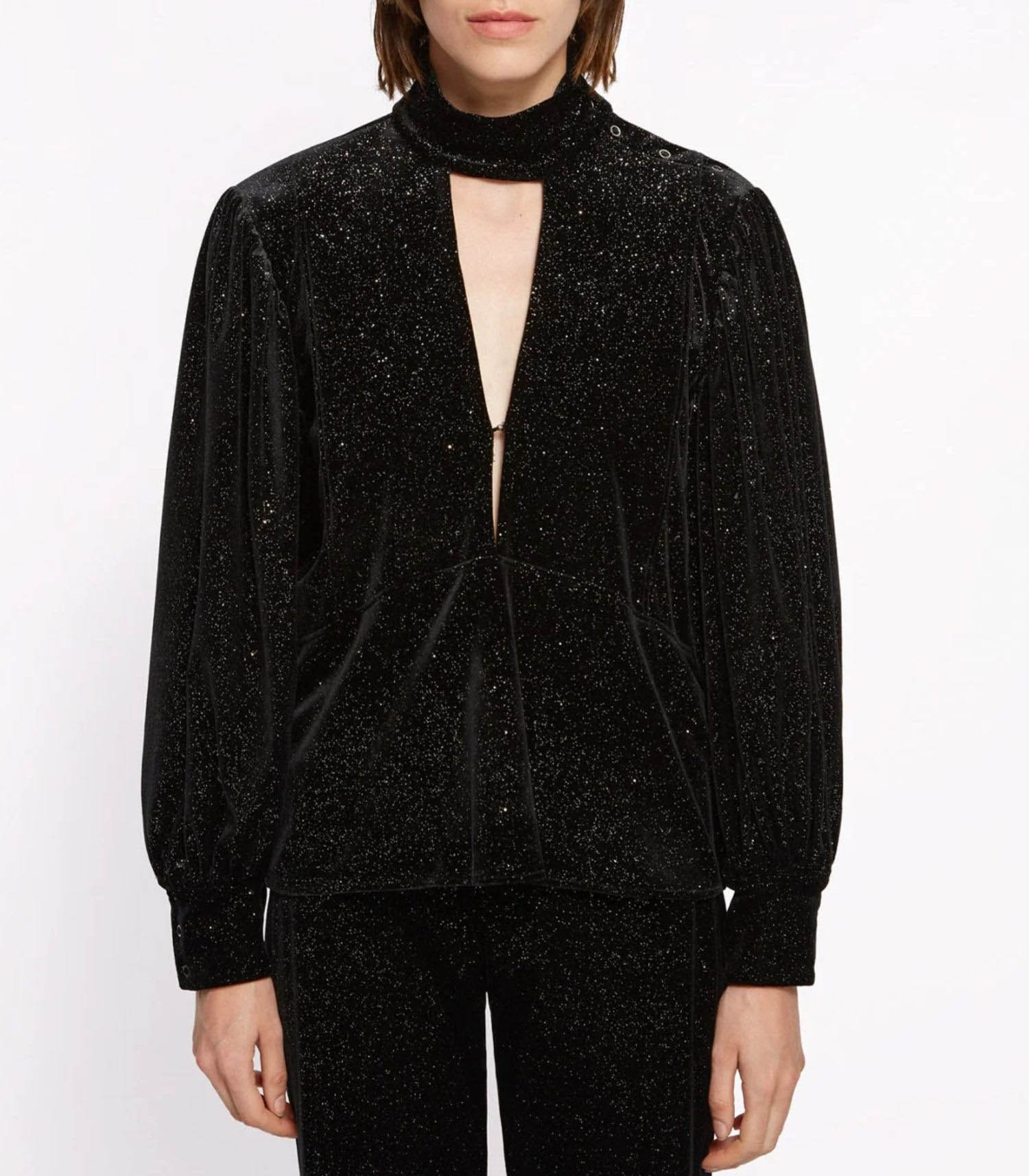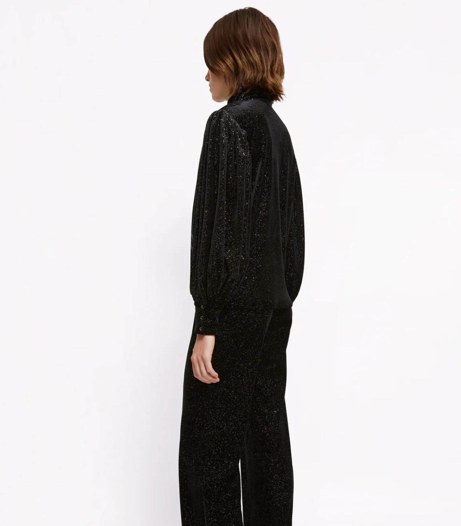 Blouse en velours noir scintillant, la Bianca Galaxie de Roseanna séduit par sa coupe ajustée, son col boutonné élégant et ses manches ballon romantiques. Un modèle féminin et sophistiqué, idéal pour briller en soirée.