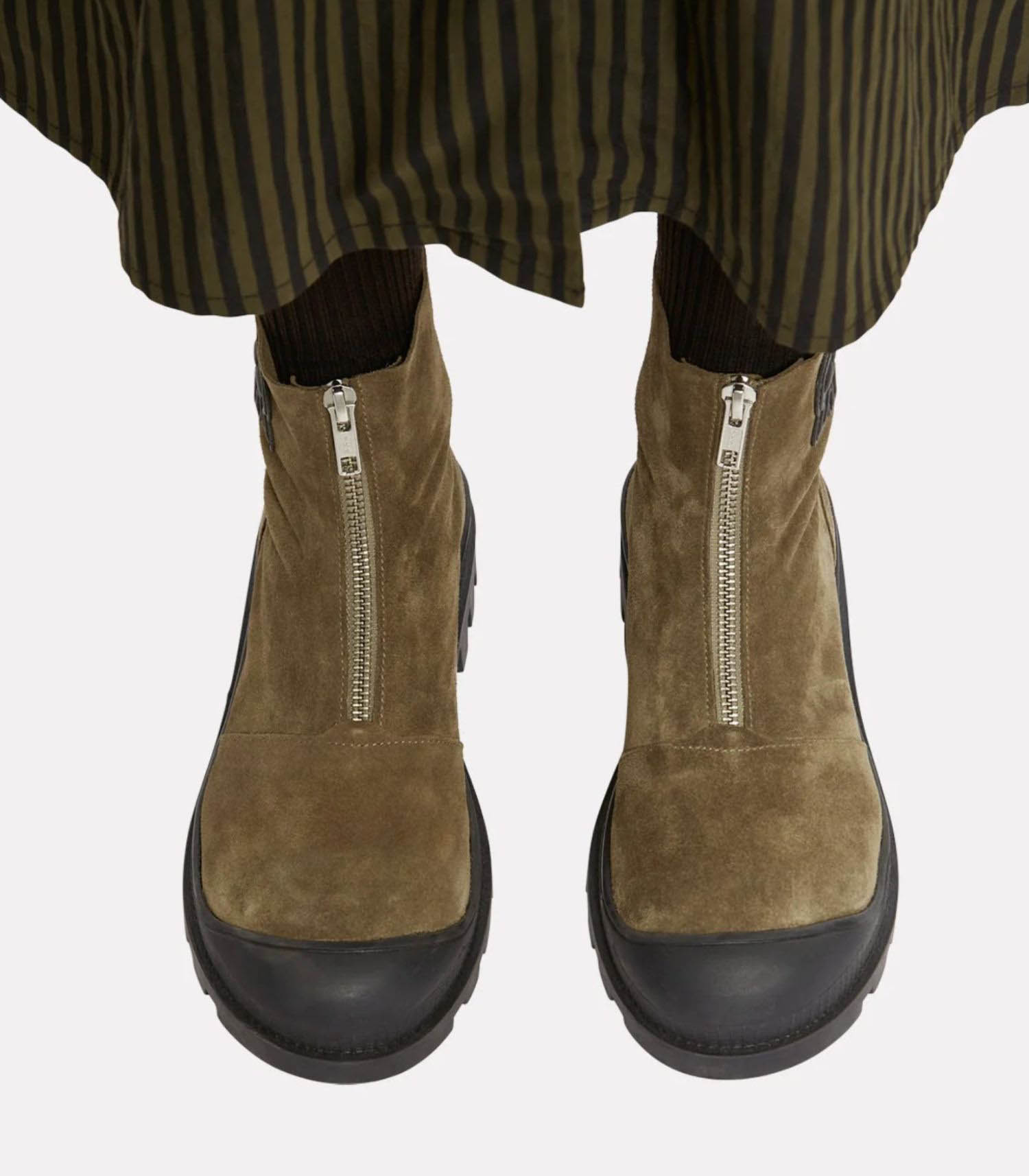 Bottines NEVADA en cuir suédé kaki, une paire signée Roseanna, stylée et robuste. Conçues avec une fermeture zippée pratique et une semelle crantée tout-terrain, ces bottines mêlent allure contemporaine et fonctionnalité. Le petit logo noir ?R sur le côté apporte une touche de caractère subtile. Confectionnées au Portugal dans un cuir suédé doux et qualitatif, elles incarnent l’élégance urbaine.